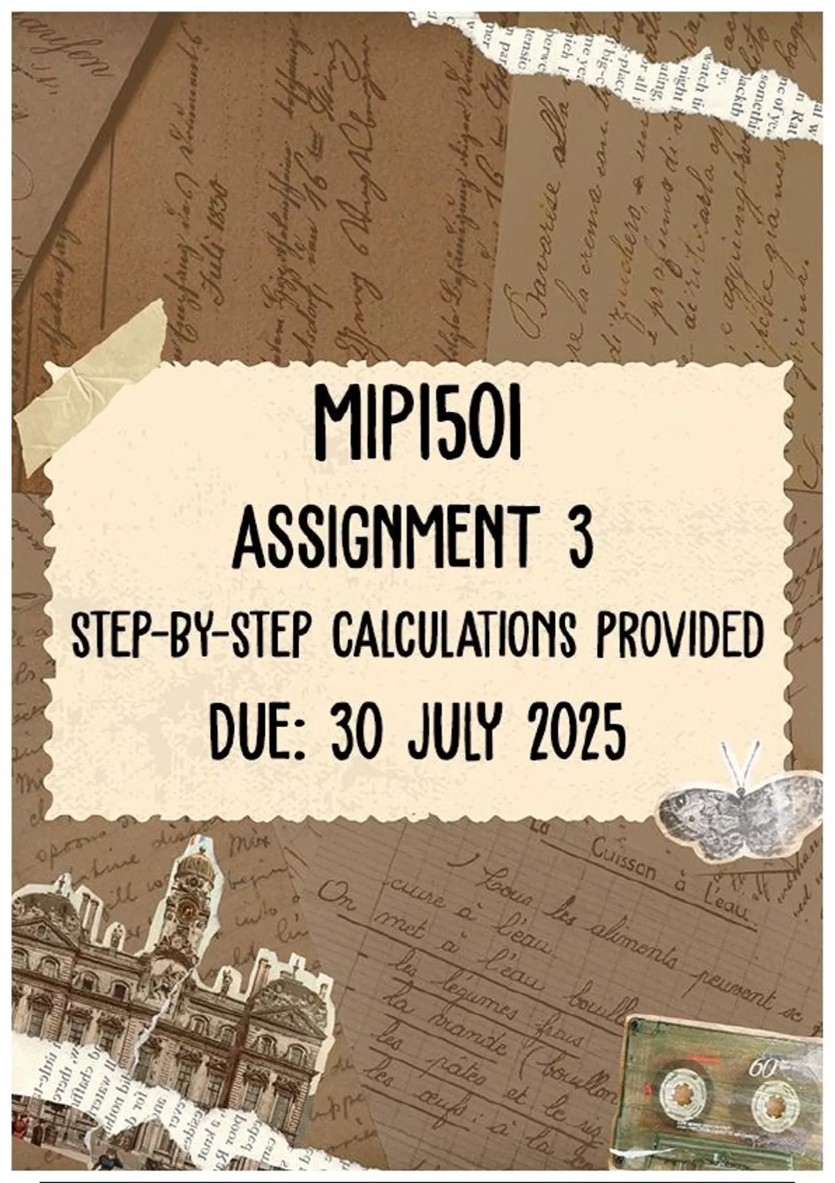 MIP1501 Assignment 3 Memo | Due 30 July 2025. Step-by-Step Calculations Provided. This document contains a fully answered assignment with complete answers to all questions and tasks. Every section is carefully completed to ensure a guaranteed pass. Perfect for guaranteed pass, high marks, and peace of mind.