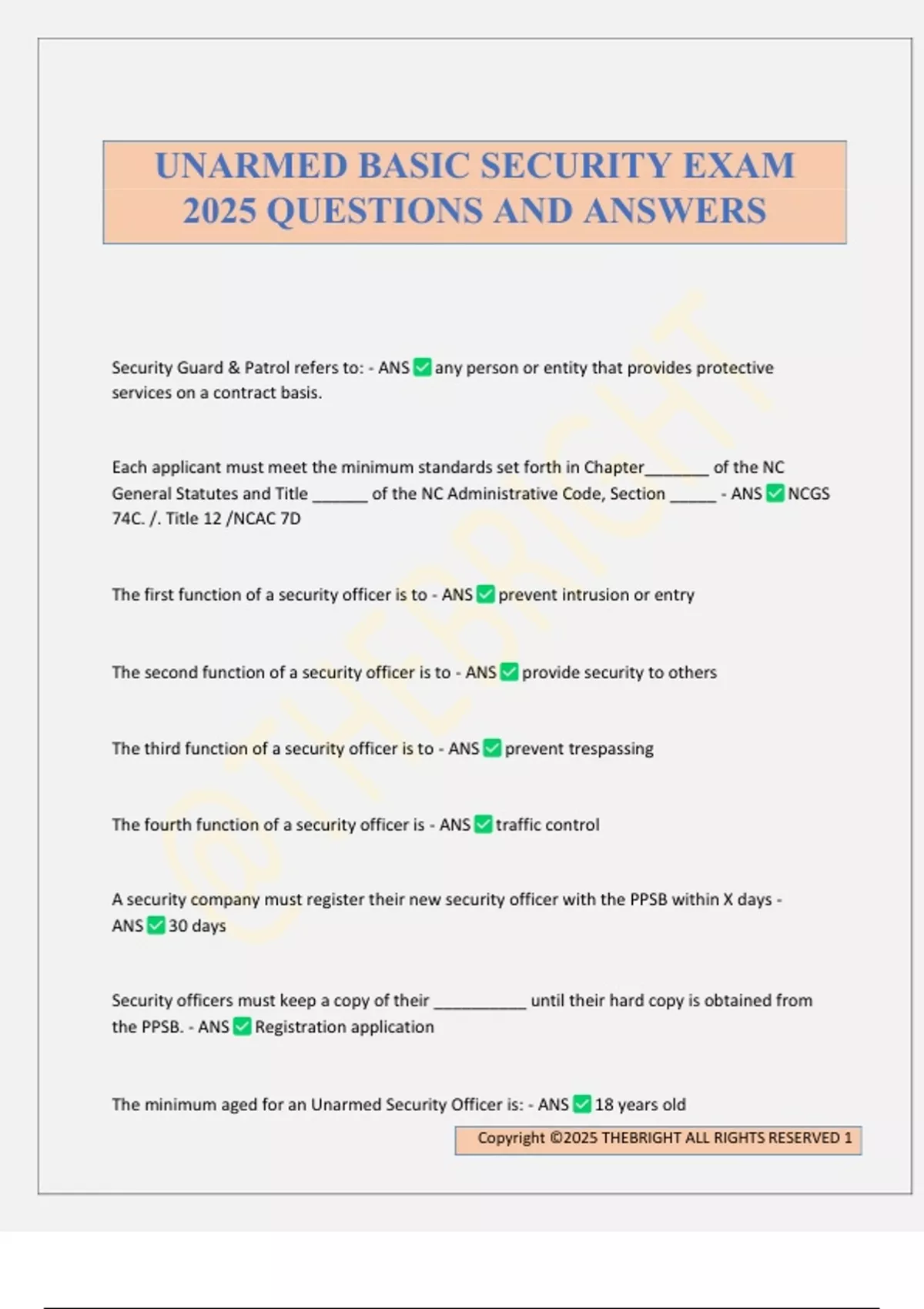 Security Guard & Patrol refers to: - ANS any person or entity that provides protective services on a contract basis. Each applicant must meet the minimum standards set forth in Chapter_______ of the NC General Statutes and Title ______ of the NC Administrative Code, Section _____ - ANS NCGS 74C. /. Title 12 /NCAC 7D The first function of a security officer is to - ANS prevent intrusion or entry The second function of a security officer is to - ANS provide security to others The third function of a security officer is to - ANS prevent trespassing The fourth function of a security officer is - ANS traffic control A security company must register their new security officer with the PPSB within X days - ANS 30 days Security officers must keep a copy of their __________ until their hard copy is obtained from the PPSB. - ANS Registration application The minimum aged for an Unarmed Security Officer is: - ANS 18 years old UNARMED BASIC SECURITY EXAM 2025 QUESTIONS AND ANSWERS Copyright ©2025 THEBRIGHT ALL RIGHTS RESERVED 2 The minimum age for a Armed Security Officer is: - ANS 21 years The applicant must be either a ________ of the US or a ___________ - ANS US Citizen or Registered alien Convictionsn including ____________ and/or __________ will most likely prevent an applicant from becoming registered. - ANS Firearms and/or illegal drugs Making a _________ statement on your applicaton may prevent your approval - ANS False Security officer uniforms may not, under any circumstances have the words __________ or __________ on them. - ANS "Police" or "Law Enforcement" Annual renewals should be sent into the PPSB at least ________ prior to expiration - ANS 90 days The five components to communication are: - ANS 1. Sender 2. Receiver 3. Message 4. Medium 5. Feedback The "Five W's" are: -