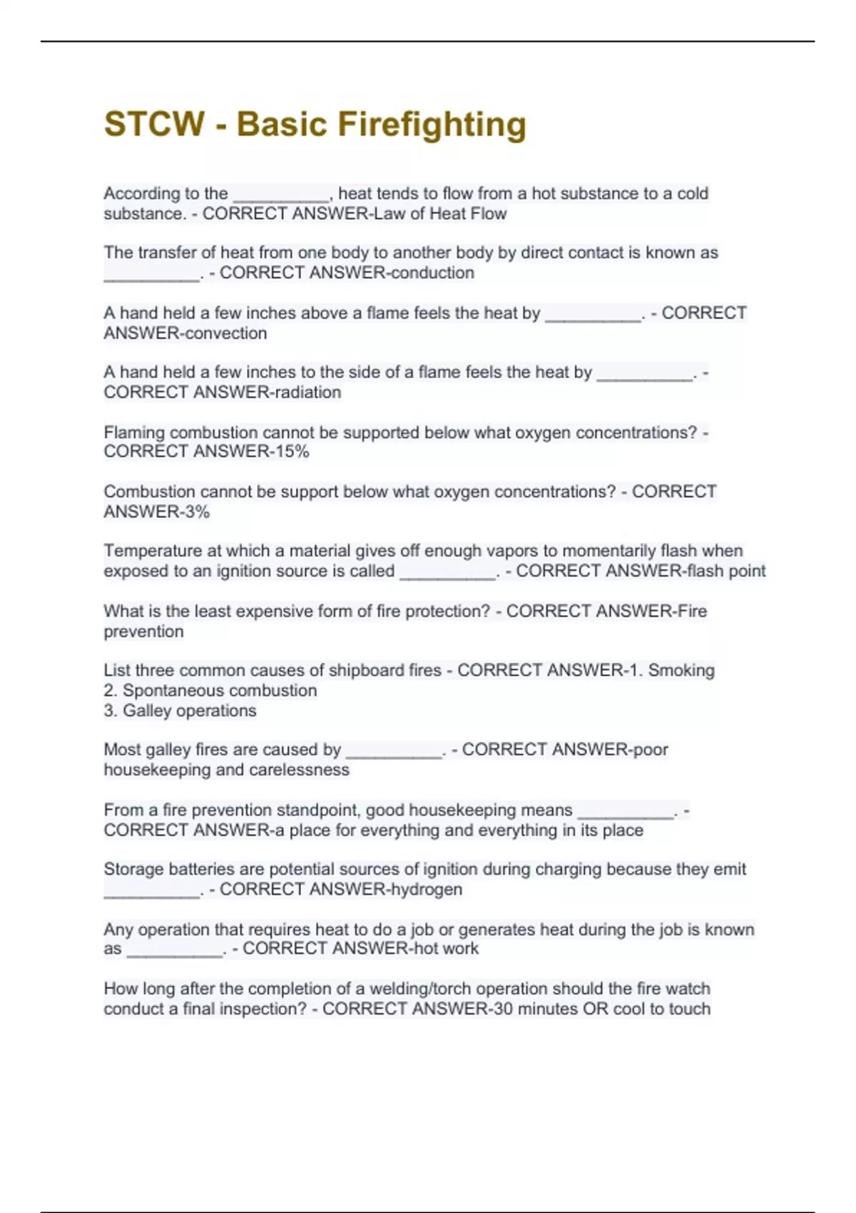 STCW - Basic Firefighting Questions and Answers Solved 100%