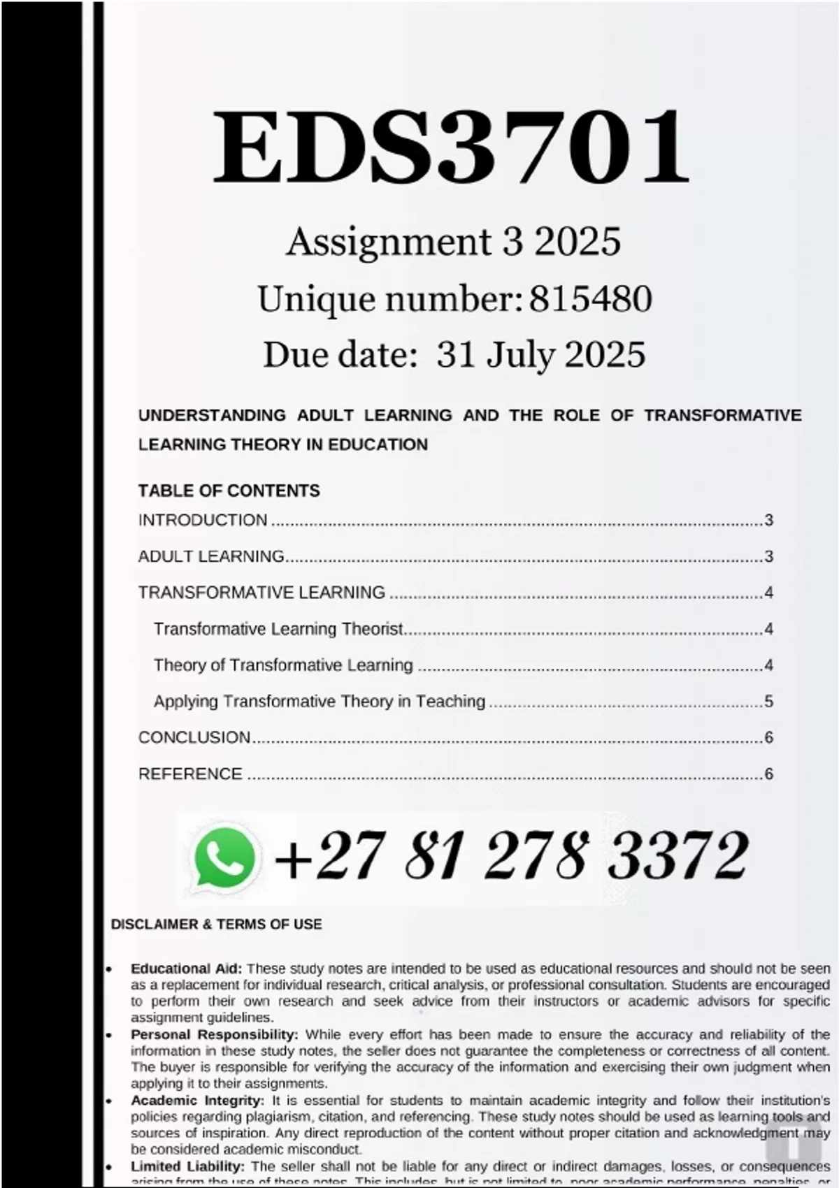 EDS3701 Assignment 3 (100% ANSWERS) 2025 - DUE 31 July 2025 Other Answer the following questions and give detailed answer and provides examples where necessary, you must also include introduction and conclusion Cities your sources and give list references 3.1 Adults learn differently form children. Explain adult learning in your own words. (5) 3.2 What is the name of the theorist who came up with the theory on transformative learning in adult education? (2) 3.3 Explain to your own students what the theory of transformative learning is about. (8) 3.4 Discuss how you can use the transformative theory when teaching your students. 2.1 Adults learn differently form children. Explain adult learning in your own words. 2.2 What is the name of the theorist who came up with the theory on transformative learni in adult education? 2.3 Explain to your own students what the theory of transformative learning is about. 2.4 Discuss how you can use the transformative theory when teaching your students.