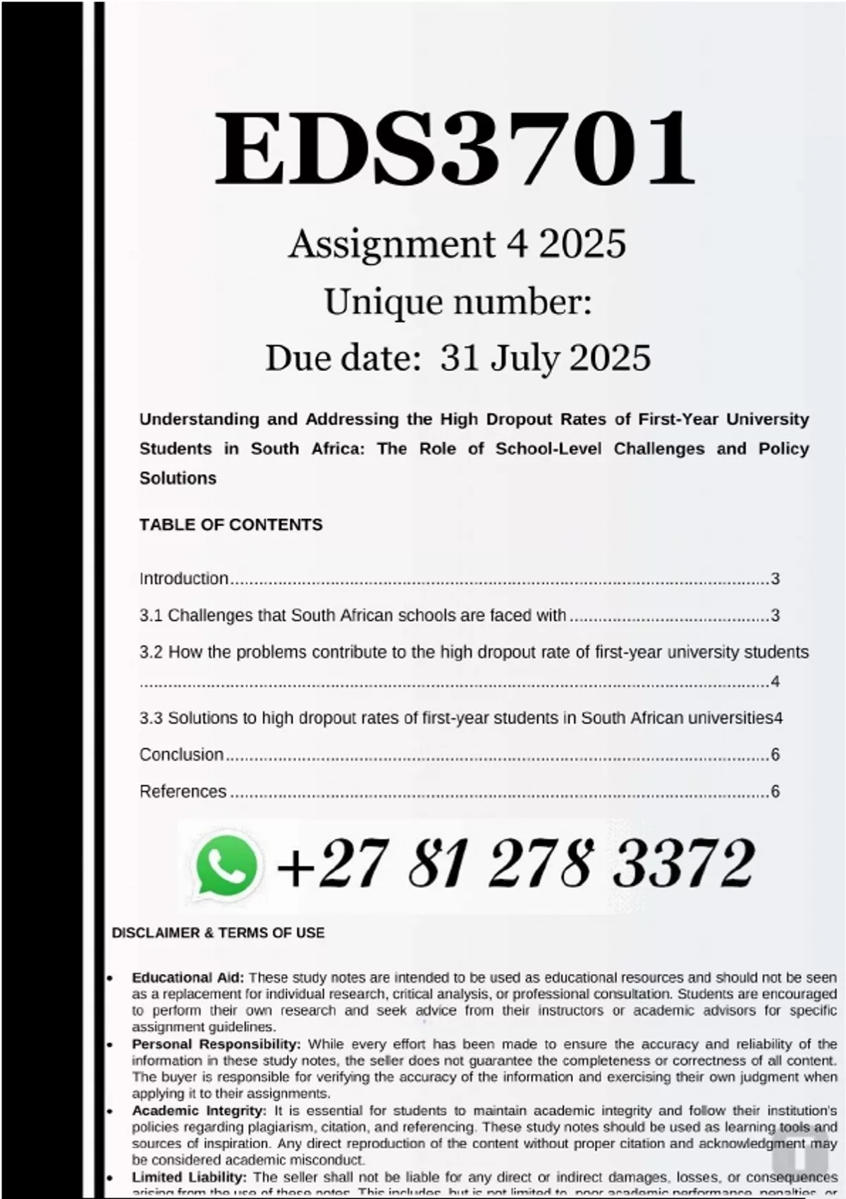 EDS3701 Assignment 4 (100% ANSWERS) 2025 - DUE 31 July 2025 .. There is concern about the university dropout rates in South Africa which are remarkably high — between 50% and 60% of first-year students. Among other challenges that schools in South Africa are faced with, many people think the 30% pass rate in schools is the cause of the problem. Answer the questions below: 3.1 What are the other challenges that South African schools are faced with? (Mention at least 4) (4) 3.2 How do the problems mentioned above in 3.1 contribute to the high dropout rate of first-year university students? (6) 3.3 As a new Minister of Education, how can you solve the problem of high dropout rates of first-year students in South African universities? (10)