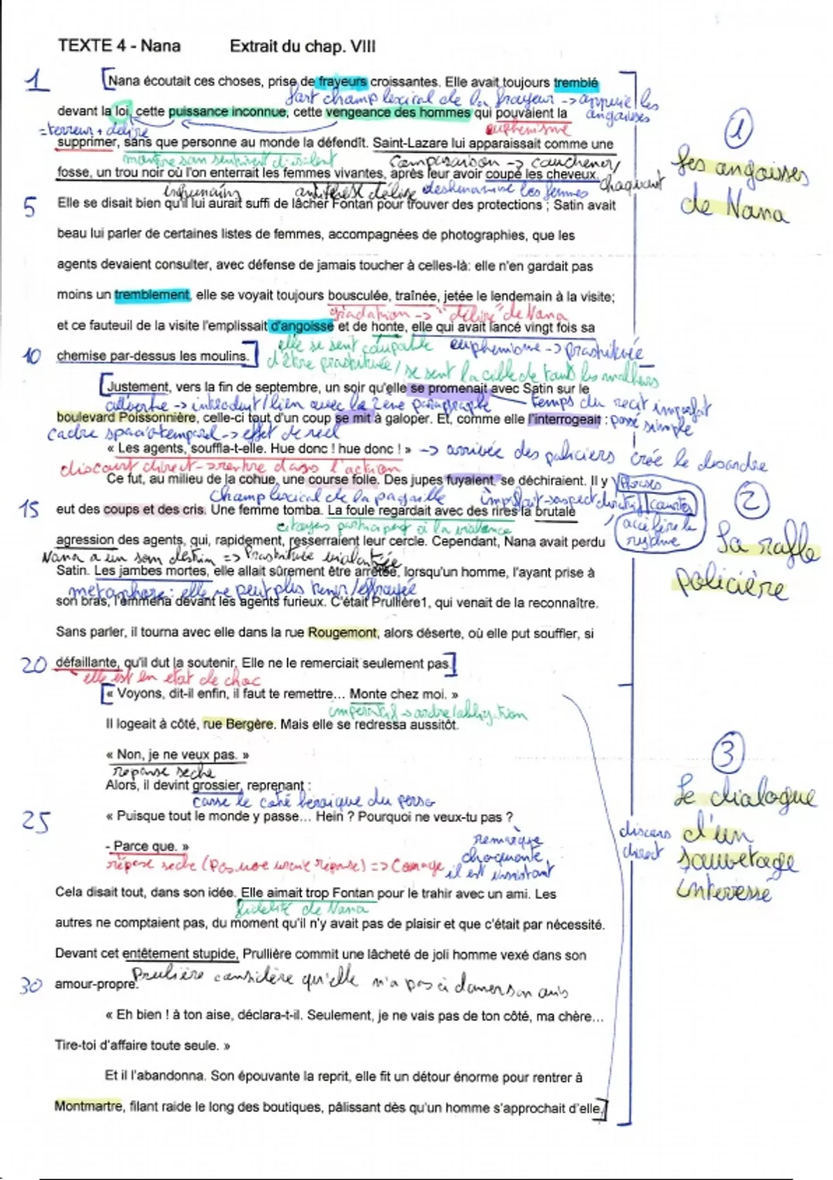 Analyse linéaire autonome (5 p.) d’un extrait central de Nana : la fuite de l’héroïne durant une rafle policière dans Paris. Le commentaire suit pas à pas la scène : focalisation interne, frénésie urbaine, dénonciation du pouvoir répressif sous le Second Empire. Repères historiques, étude du registre réaliste/naturaliste, plan détaillé + propositions d’ouverture (condition féminine, ville-monde, spectacularisation de la misère). Outil complet pour réussir l’oral EAF ou un exposé sur Zola.