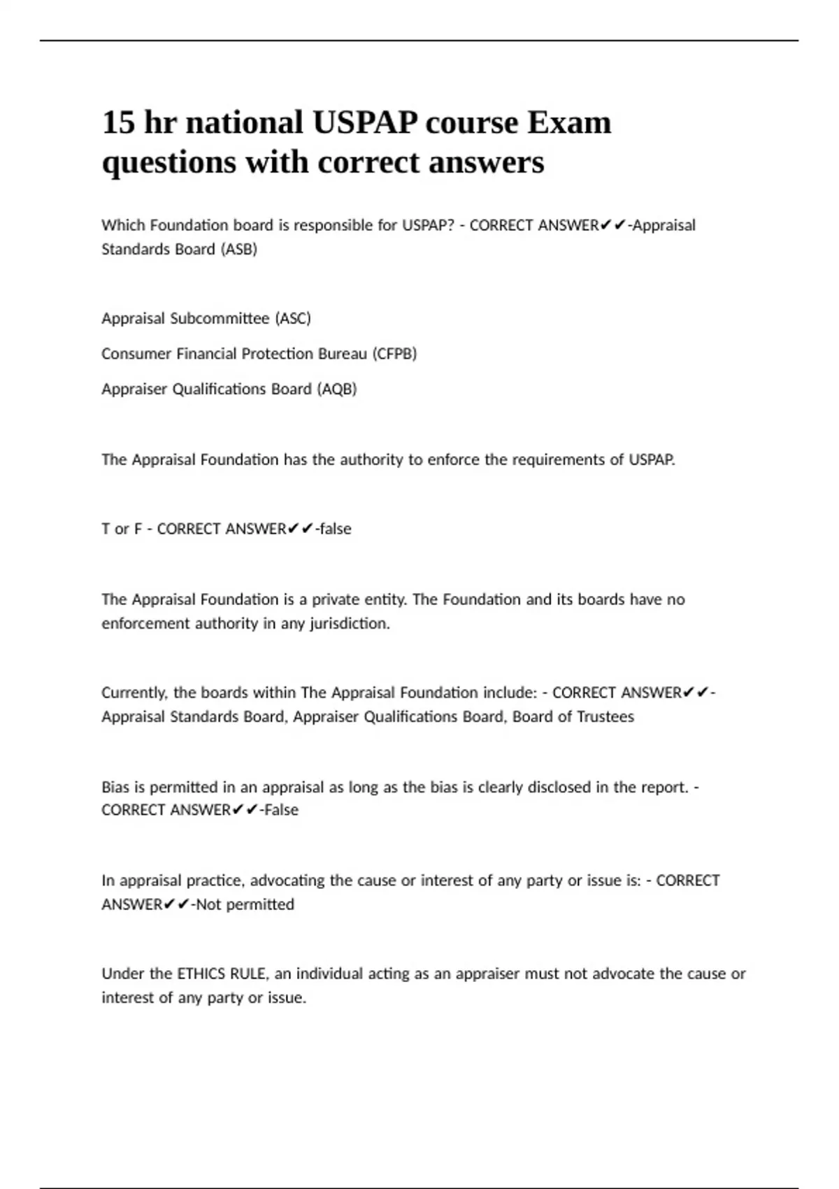 Which |Foundation |board |is |responsible |for |USPAP? |- |CORRECT |ANSWER✔✔-Appraisal |