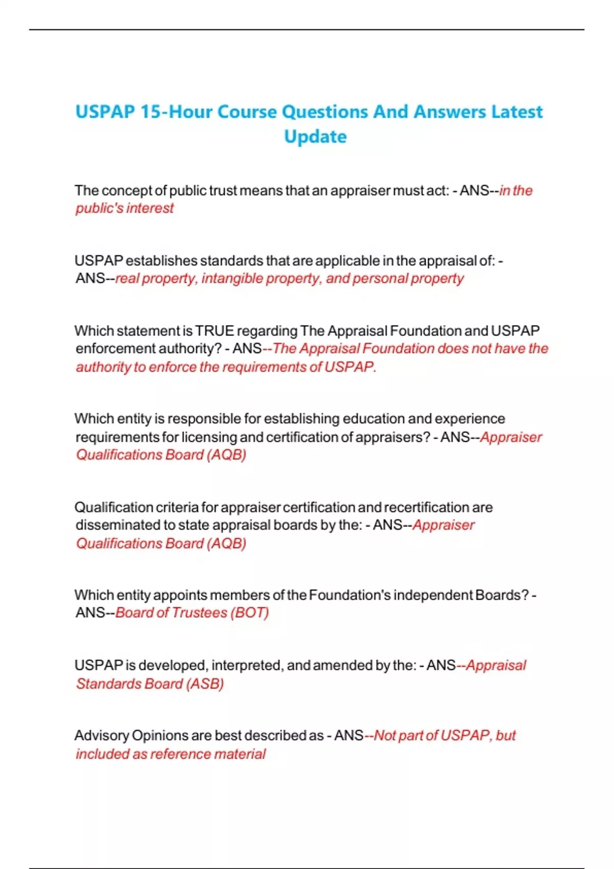 USPAP 15-Hour Course Questions And Answers Latest Update