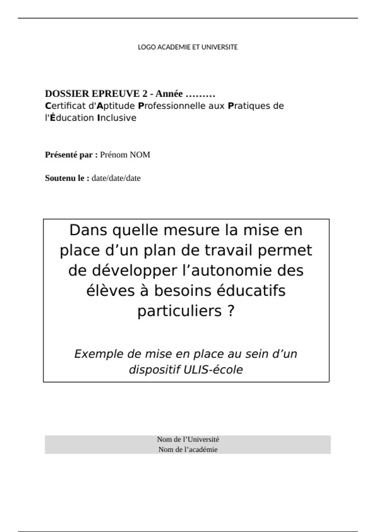Dossier pour l'épreuve 2 du CAPPEI (certificat d'aptitude professionnelle aux pratiques de l'éducation inclusive), portant sur la mise en place d'un plan de travail pour favoriser l'autonomie des élèves à besoins éducatifs particulier, dans le cadre d'un dispositif ULIS école. Epreuve validée en juin 2025