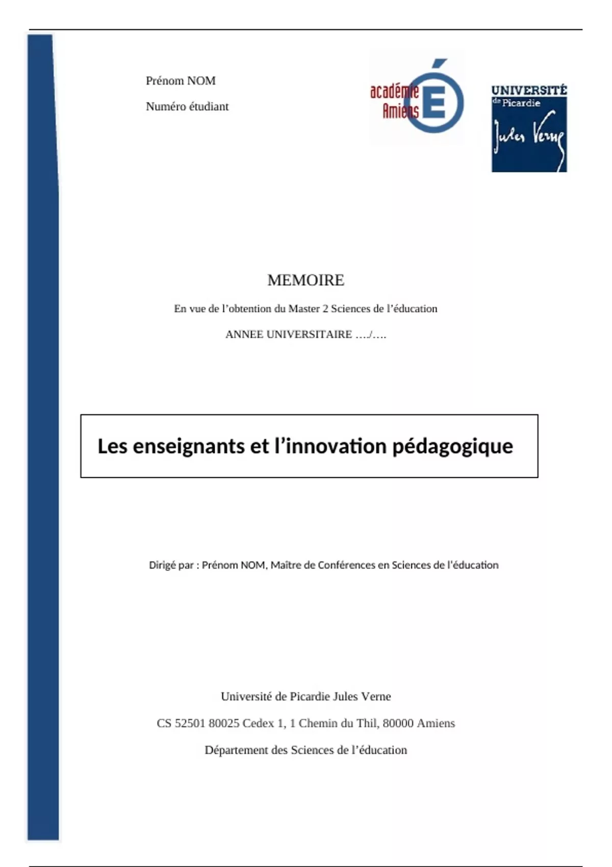 Ce mémoire de Master 2 en Sciences de l’éducation analyse les rapports qu’entretiennent les enseignants avec l’innovation pédagogique. À travers une partie théorique fondée sur des chercheurs reconnus (Alter, Cros, Marsollier, Huberman…) et une enquête menée au sein du Rectorat de l’Académie d’Amiens, l’auteure tente de répondre à cette question : Existe-t-il une typologie de l’enseignant innovateur ? Le mémoire propose : Un état de l’art complet sur l’innovation en éducation Des grilles d’analyse des profils d’enseignants innovants vs non-innovants Une méthodologie rigoureuse avec entretiens et questionnaires Format Word / PDF – 100 % réutilisable pour inspiration, fiches de lecture, introduction de dossier, etc.