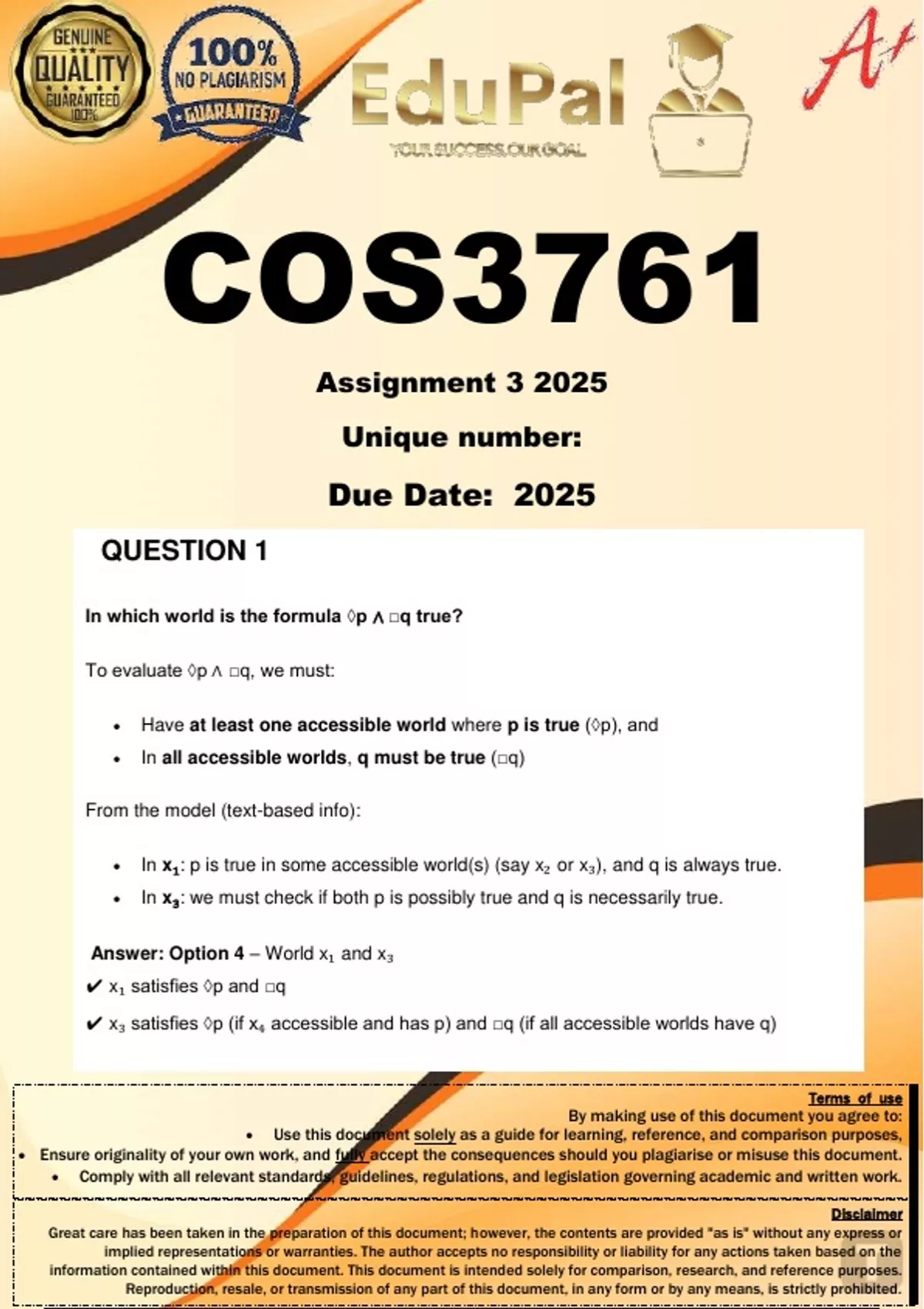 COS3761 Assignment 3 (COMPLETE ANSWERS) 2025 - DUE July 2025; 100% TRUSTED Complete, trusted solutions and explanations. For assistance, Whats-App 0.6.7-1.7.1-1.7.3.9. Ensure your success with us.. QUESTION 1 In which world of the Kripke model in Figure 1 is the formula ◊ p  □ q true? Option 1: world x₁ Option 2: world x₂ Option 3: world x₃, Option 4: Option 1 and Option 3 are true. UESTION 2 Which of the following does not hold in the Kripke model in Figure 1? Option 1: x₁ ╟ ◊ ◊ p .Option 2: x₂ ╟ □ p .Option 3: x₃ ╟ □ p  □ q .Option 4: x₄ ╟ □□ p QUESTION 3 Which of the following holds in the Kripke model given in Figure 1? Option 1: x₁ ╟ □ p .Option 2: x₂ ╟ ◊ ( p  q) .Option 3: x₃ ╟ ◊ p  □ ¬ q q p, q q p q x₁ x₄ x₃ q Downloaded by Vusi Xhumalo () lOMoARcPSD| COS3761/103/2025 20 Option 4: x₄ ╟ □ (p  q) . QUESTION 4 Which of the following formulas is true in the Kripke model given in Figure 1? Option 1: ◊ p Option 2: □ q Option 3: □ ◊ q Option 4: □ p QUESTION 5 Which of the following formulas is false in the Kripke model given in Figure 1? Option 1: p  q Option 2: □ ◊ p Option 3: □ (p  q) Option 4: p  ◊ q QUESTION 6 If we interpret □  as "It ought to be that  ", which of the following formulas correctly expresses the English sentence It ought to be the case that if it rains outside then it is permitted to take leave from work. : p stands for the declarative sentence "It rains outside" and q stands for "take leave from work"? Option 1: □ (p ¬ □ ¬ q) Option 2: □( p ¬ ◊ q) Option 3: □ p  ◊ ¬ q Option 4: □ p  □ q .QUESTION 7 Downloaded by Vusi Xhumalo () lOMoARcPSD| COS3761/103/2025 21 If we interpret □  as "It is necessarily true that  ", why should the formula scheme □   □ □  hold in this modality? Option 1: Because for all formulas , it is necessarily true that if  then . Option 2:Because for all formulas , if  is necessarily true, then it is necessary that it is necessarily true. Option 3:Because for all formulas , if  is not possibly true, then it is true. Option 4: Because for all formulas ,  is necessarily true if it is true. QUESTION 8 If we interpret □  as "the agent knows  ", why should the formula scheme □   □ □  hold in this modality? Option 1: If the agent knows something he knows that he knows it. Option 2: the agent knows something it doesn’t mean that he knows. Option 3: If the agent does not know something, he again knows that he knows it. Option 4: If the agent knows something, he knows that he does not know it. QUESTION 9 If we interpret □  as "it is necessarily true", which of the following formulas is not valid? Option 1: □ p  p Option 2: □ p  □¬ p Option 3: □ p  ◊ p Option 4: ◊ p  □ ◊ p Downloaded by Vusi Xhumalo () lOMoARcPSD| COS3761/103/2025 22 QUESTION 10 If we interpret □  as "agent A believes  ", what is the modal translation of the English sentence If agent A believes p then he believes that agent A does not believe q. Option 1: □ p □ q Option 2: □ p  ¬□ q Option 3: □ p  ¬□¬ q Option 4: □ p  □¬ q QUESTION 11 If we interpret □  as "Agent A believes  ", English translation of the formula □ p  □ ¬ q ? Option 1: If Agent A believes  then Agent A believes not . Option 2 : If Agent A believes  then Agent A does not believe . Option 3: If Agent A believes  then Agent A believes . Option 4: If Agent A believes  then Agent A does not believe not . QUESTION 12 If we interpret Kᵢ as “agent 1 knows ”, the formula scheme ¬  K₁ ¬ K₁  means Option 1: If  is true then agent 1 knows that he does not know  Option 2: If  is false then agent 1 knows that he does not know  Option 3: If  is true then agent 1 knows that he knows  Option 4: If  is false then agent 1 knows that he knows  The following natural deduction proof (without reasons) is referred to in Questions 13, 14 and 15: 1 ¬ □ ¬ (p  q) Downloaded by Vusi Xhumalo () lOMoARcPSD| COS3761/103/2025 23 2 □ p 3 □ ¬ q 4 p  q assumption 5 p □ e 2 6 q  e 4, 5 7 ¬ q □ e 3 8  ¬ e 6, 7 9 ¬ (p  q) ¬ i 4 - 8 10 □ ¬ (p  q) □ i 4 - 9 11  ¬ e 10, 1 12 ¬ □ ¬ q ¬ i 3 - 11 13 □ p  ¬ □ ¬ q  i 2 – 12 QUESTION 13 How many times are □ elimination and introduction rules used in the above proof? Option 1: None Option 2: □ elimination and □ introduction once are both used only once. Option 3: □ elimination is used only once but □ introduction twice. Option 4: □ elimination is used twice but □ introduction only once. QUESTION 14 What are the correct reasons for steps 1, 2 and 3 of the above proof? Option 1: 1 premise 2 assumption 3 assumption Downloaded by Vusi Xhumalo () lOMoARcPSD| COS3761/103/2025 24 Option 2: 1 premise 2 ¬e 1 3 ¬i 2 Option 3: 1 assumption 2 ¬e 1 3 □e 4 Option 4: 1 assumption 2 □i 2 3 assumption QUESTION 15 What sequent is proved by the above proof? Option 1: □ p  ◊ p Option 2: □ p  ¬ □ ¬ q Option 3: ¬ □ ¬ q Option 4: No proof The following incomplete natural deduction proof is referred to in Questions 16 and 17: 1 2 3 4 5 6 7 8 □ (p  q) →□ p □ q □ (p  q) assumption □p □ i3 □q □ i4 □p  □ q p  q p  e2 q e2 Downloaded by Vusi Xhumalo () lOMoARcPSD| COS3761/103/2025 25 QUESTION 16 What formulas and their reasons are missing in steps 2 and 7 of the above proof? Option 1: 2 p  q □ e1 7 □p□ q  I 5,6 Option 2: 2 p  q assumption 7 □p□ q →i 5,6 Option 3: 2 p  q □ e1 7 □p□ q  i 2 Option 4: 2 p  q assumption 7 □p  □ q  i 5,6 QUESTION 17 What rule is used in line 8? Option 1:  e Option 2: ¬e Option 3:  i Option 4:  i QUESTION 18 What proof strategy woul