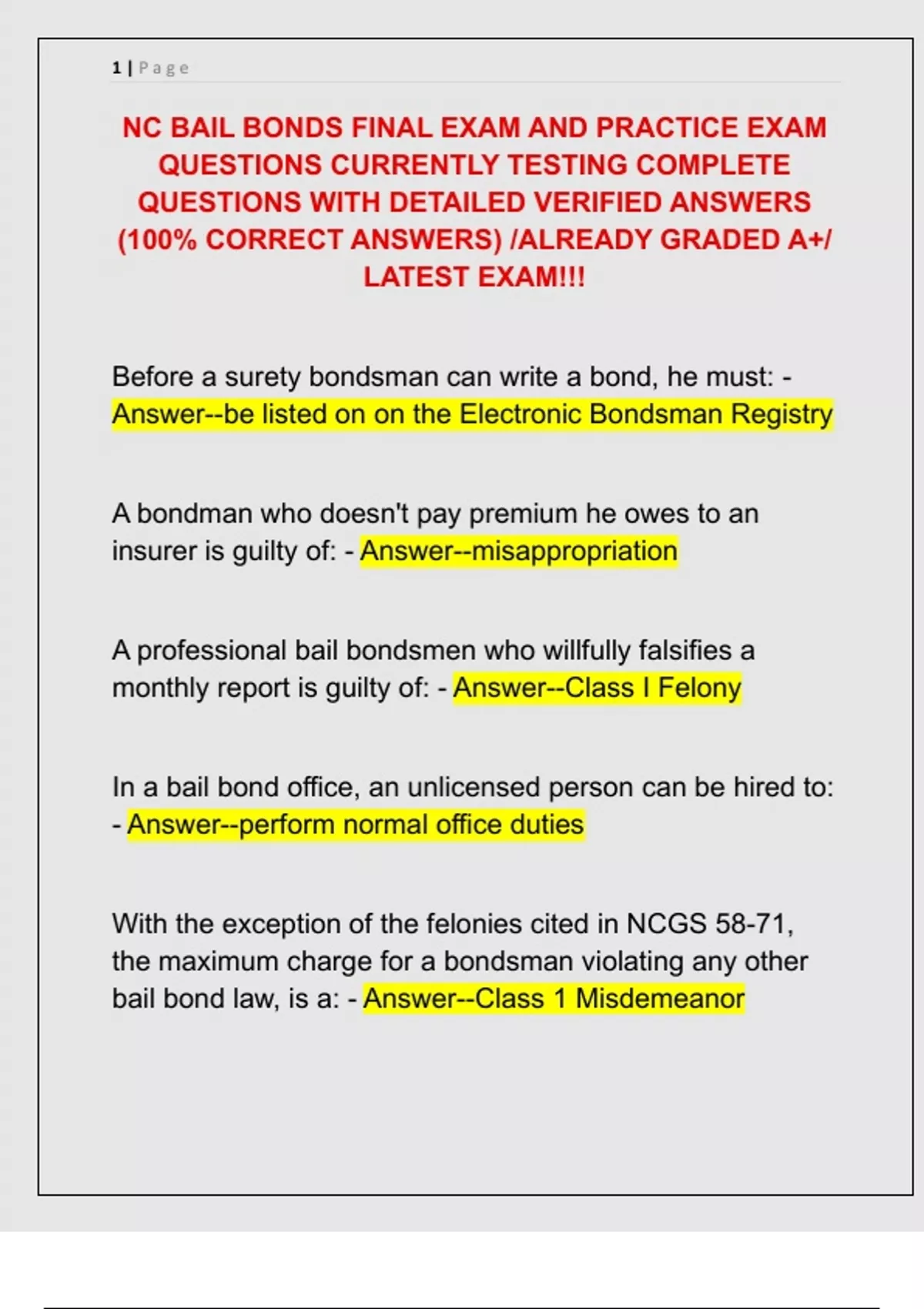 NC BAIL BONDS FINAL EXAM AND PRACTICE EXAM QUESTIONS CURRENTLY TESTING COMPLETE QUESTIONS WITH DETAILED VERIFIED ANSWERS (100% CORRECT ANSWERS) /ALREADY GRADED A+/ LATEST EXAM!!!