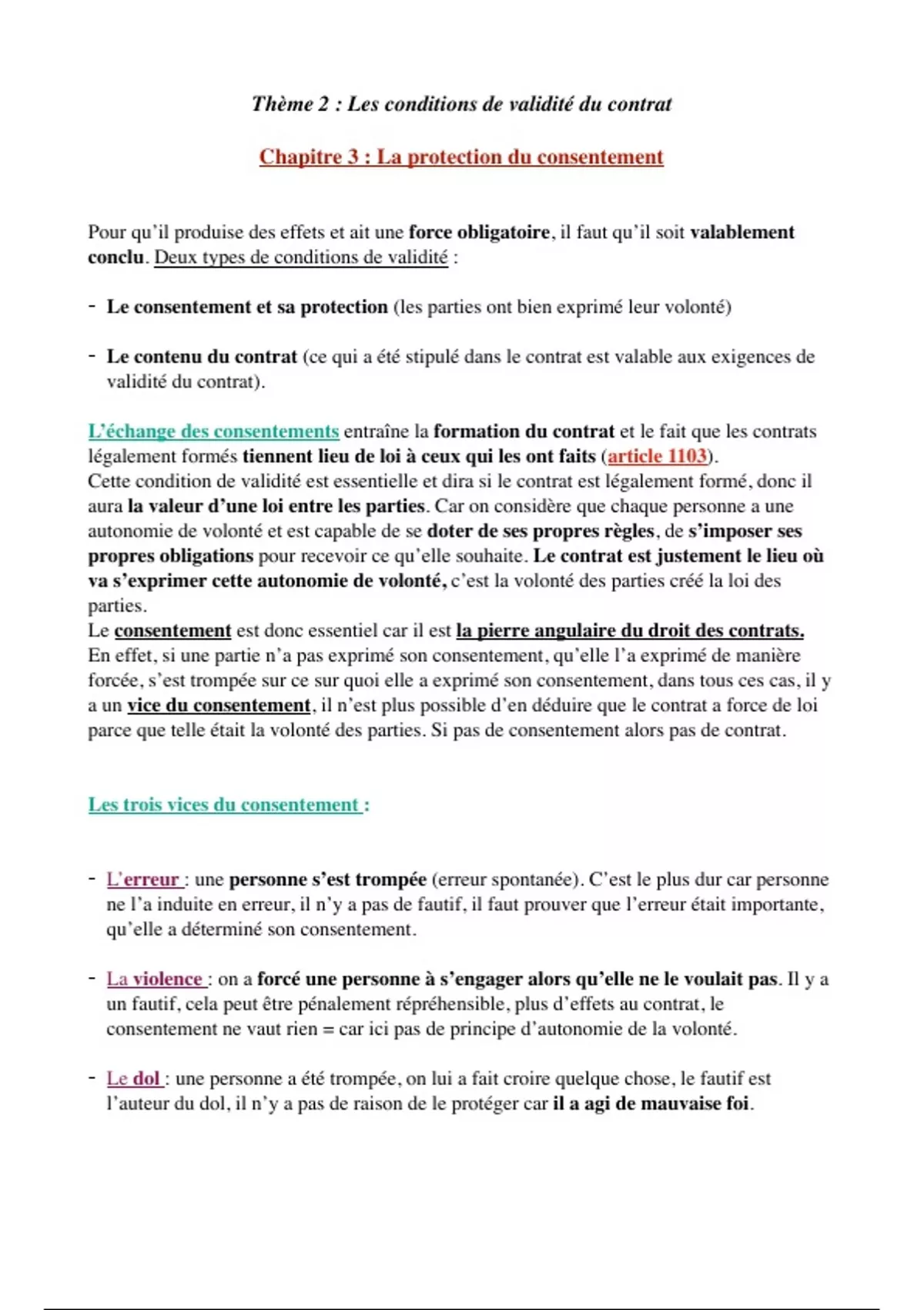 Les conditions de validité du contrat : Chapitre 3 : La protection du consentement, les vices du consentement en droit des contrats L’erreur Le dol La violence