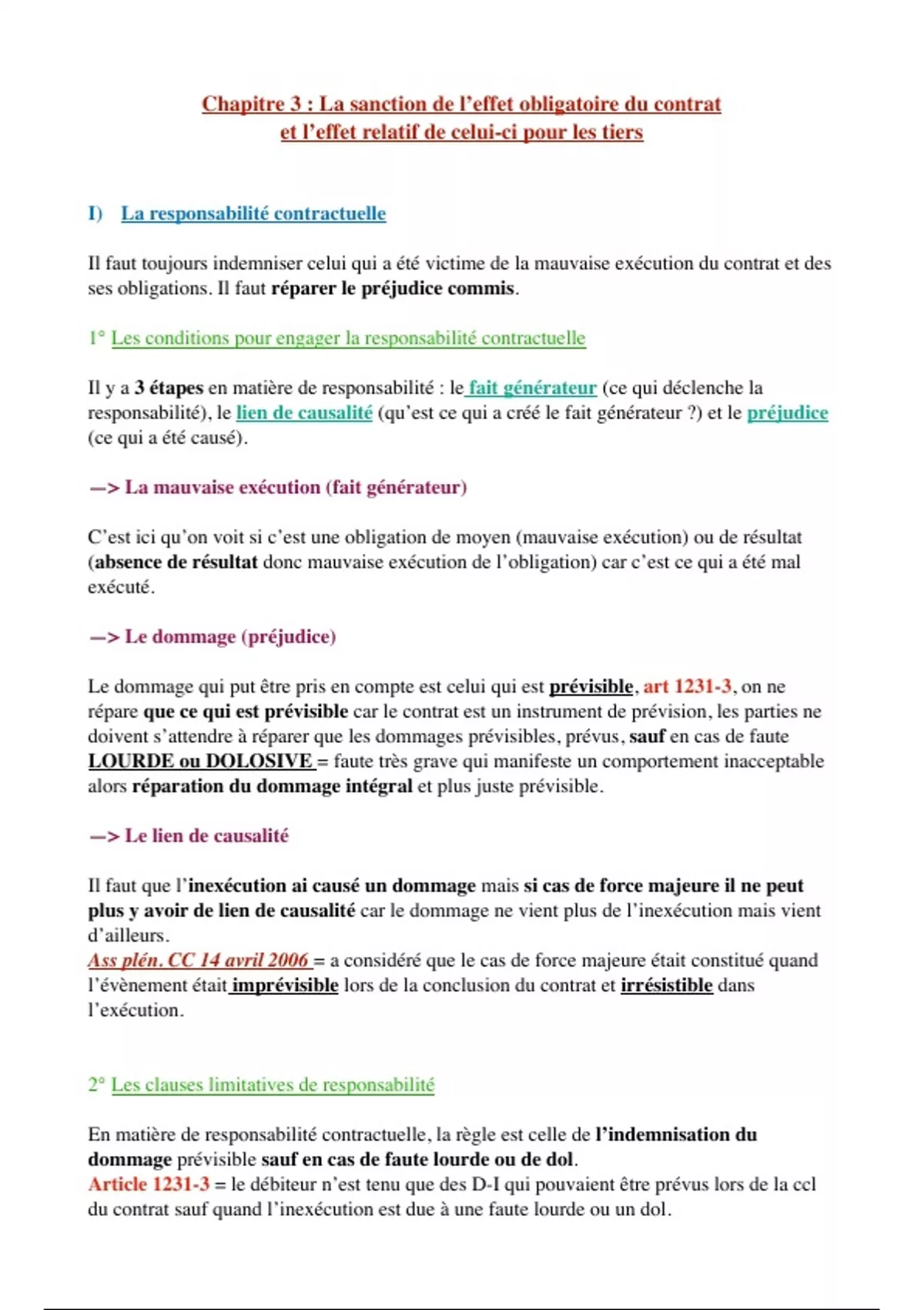 Chapitre 3 : La sanction de l’effet obligatoire du contrat et l’effet relatif de celui-ci pour les tiers La responsabilité contractuelle (conditions pour engager la responsabilité contractuelle) Les clauses limitatives de responsabilité clauses penales sort du contrat (exécution forcée, inexécution, résolution, réduction du prix) effet relatif du contrat et ses limites