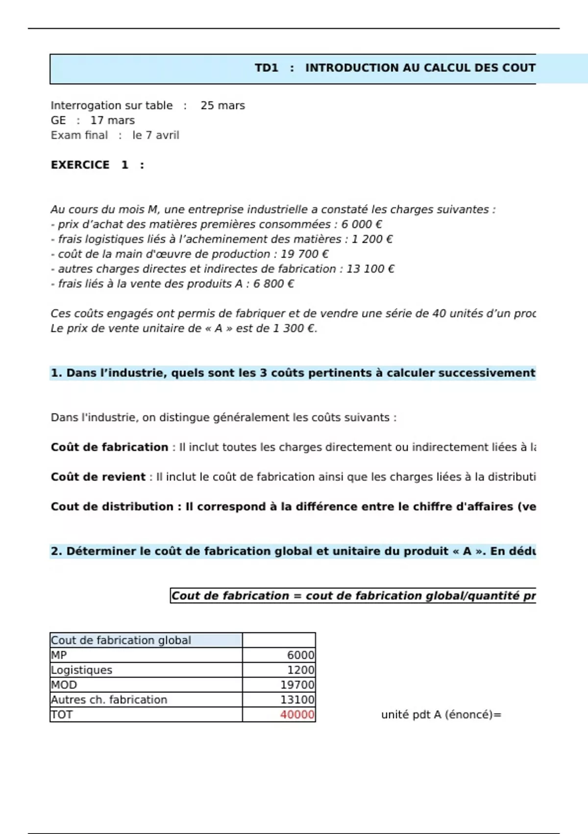 TD1 : INTRODUCTION AU CALCUL DES COUTS