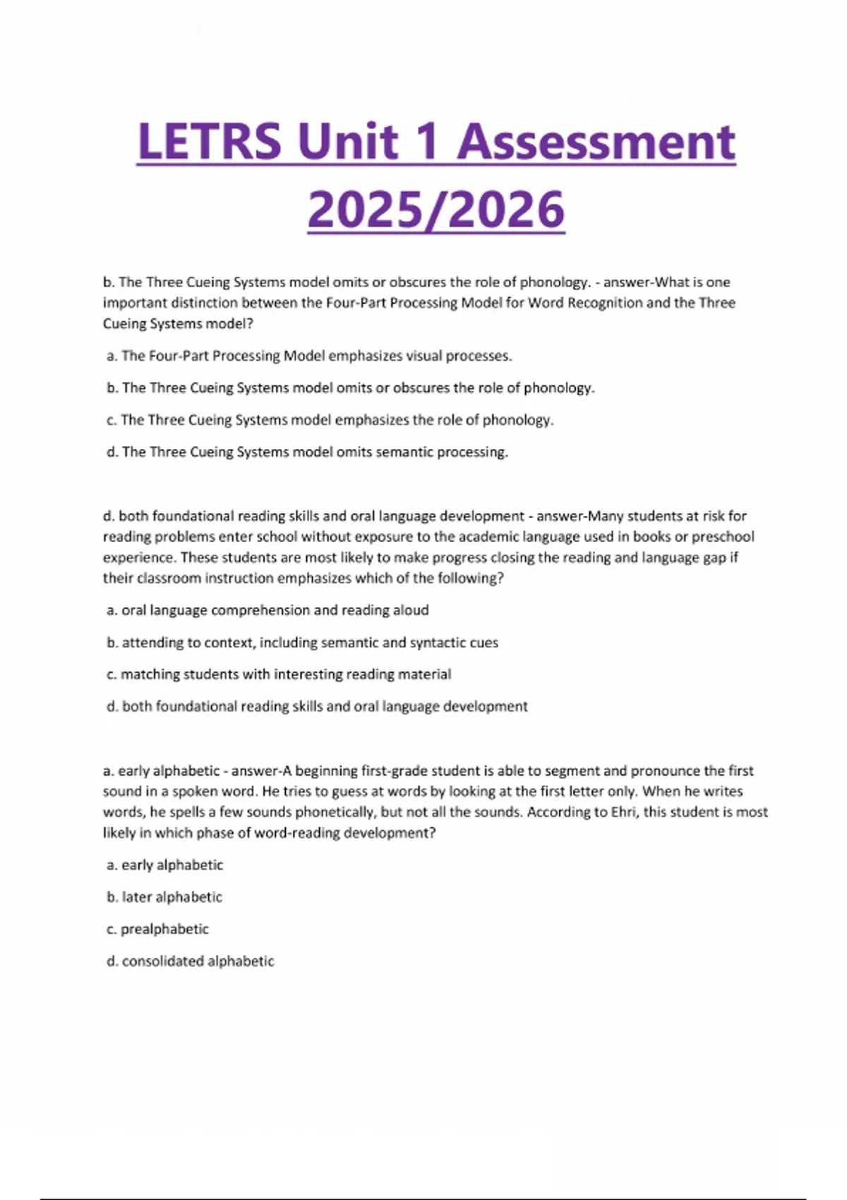 LETRS Unit 1 Assessment 2025/2026 b. The Three Cueing Systems model omits or obscures the role of phonology. - answer-What is one important distinction between the Four-Part Processing Model for Word Recognition and the Three Cueing Systems model? a. The Four-Part Processing Model emphasizes visual processes. b. The Three Cueing Systems model omits or obscures the role of phonology. c. The Three Cueing Systems model emphasizes the role of phonology. d. The Three Cueing Systems model omits semantic processing. d. both foundational reading skills and oral language development - answer-Many students at risk for reading problems enter school without exposure to the academic language used in books or preschool experience. These students are most likely to make progress closing the reading and language gap if their classroom instruction emphasizes which of the following? a. oral language comprehension and reading aloud b. attending to context, including semantic and syntactic cues c. matching students with interesting reading material d. both foundational reading skills and oral language development a. early alphabetic - answer-A beginning first-grade student is able to segment and pronounce the first sound in a spoken word. He tries to guess at words by looking at the first letter only. When he writes words, he spells a few sounds phonetically, but not all the sounds. According to Ehri, this student is most likely in which phase of word-reading development? a. early alphabetic b. later alphabetic c. prealphabetic d. consolidated alphabetic