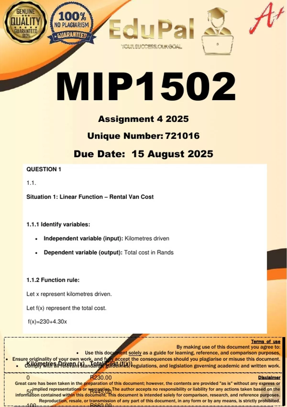MIP1502 Assignment 4 (COMPLETE ANSWERS) 2025 (721016) - DUE 15 August 2025; 100% TRUSTED Complete, trusted solutions and explanations. For assistance, Whats-App 0.6.7-1.7.1-1.7.3.9. Ensure your success with us.... Question 1 This question requires you to move beyond simply solving mathematical problems. You will analyse functional relationships, diagnose a common learner misconception based on the principles in your learning material, and design a learning activity that aligns with the CAPS curriculum for the Intermediate Phase. 1.1 Consider the two real-world situations below. The first represents a linear function, and the second represents a non-linear function. • Situation 1 (Linear): A rental van costs R230 per day plus R4,30 per kilometre driven. • Situation 2 (Non-linear): The area of a circle depends on the length of its radius. For each situation, you must: 1.1.1 Identify the independent variable (input) and the dependent variable (output). (2) 1.1.2 Write a function rule using function notation (e.g.,