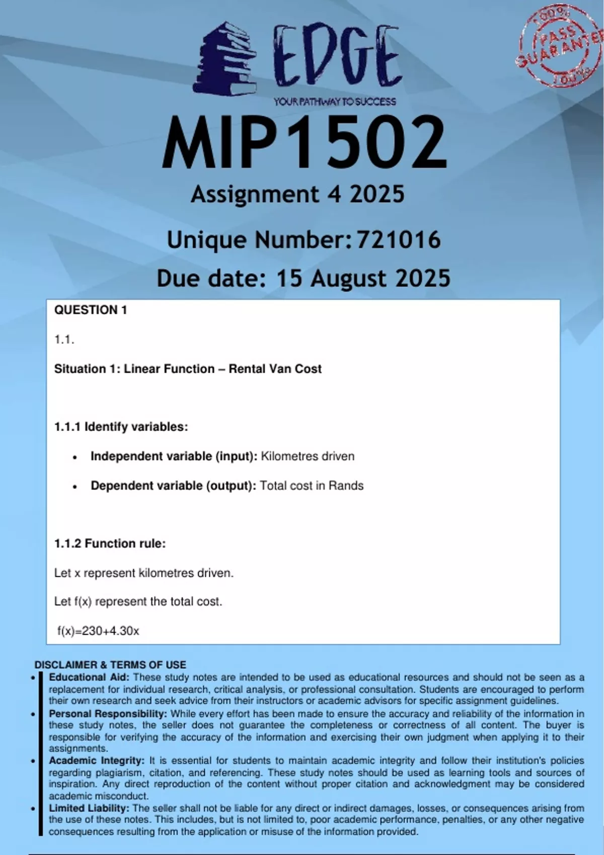 Achieve a distinction with this comprehensive and well-organized set of MIP1502 Assignment 4 (ANSWERS) 2025 - DISTINCTION GUARANTEED. Ensure accuracy and excellence in your submission!!!! Question 1 This question requires you to move beyond simply solving mathematical problems. You will analyse functional relationships, diagnose a common learner misconception based on the principles in your learning material, and design a learning activity that aligns with the CAPS curriculum for the Intermediate Phase. 1.1 Consider the two real-world situations below. The first represents a linear function, and the second represents a non-linear function. • Situation 1 (Linear): A rental van costs R230 per day plus R4,30 per kilometre driven. • Situation 2 (Non-linear): The area of a circle depends on the length of its radius. For each situation, you must: 1.1.1 Identify the independent variable (input) and the dependent variable (output). (2) 1.1.2 Write a function rule using function notation (e.g.,