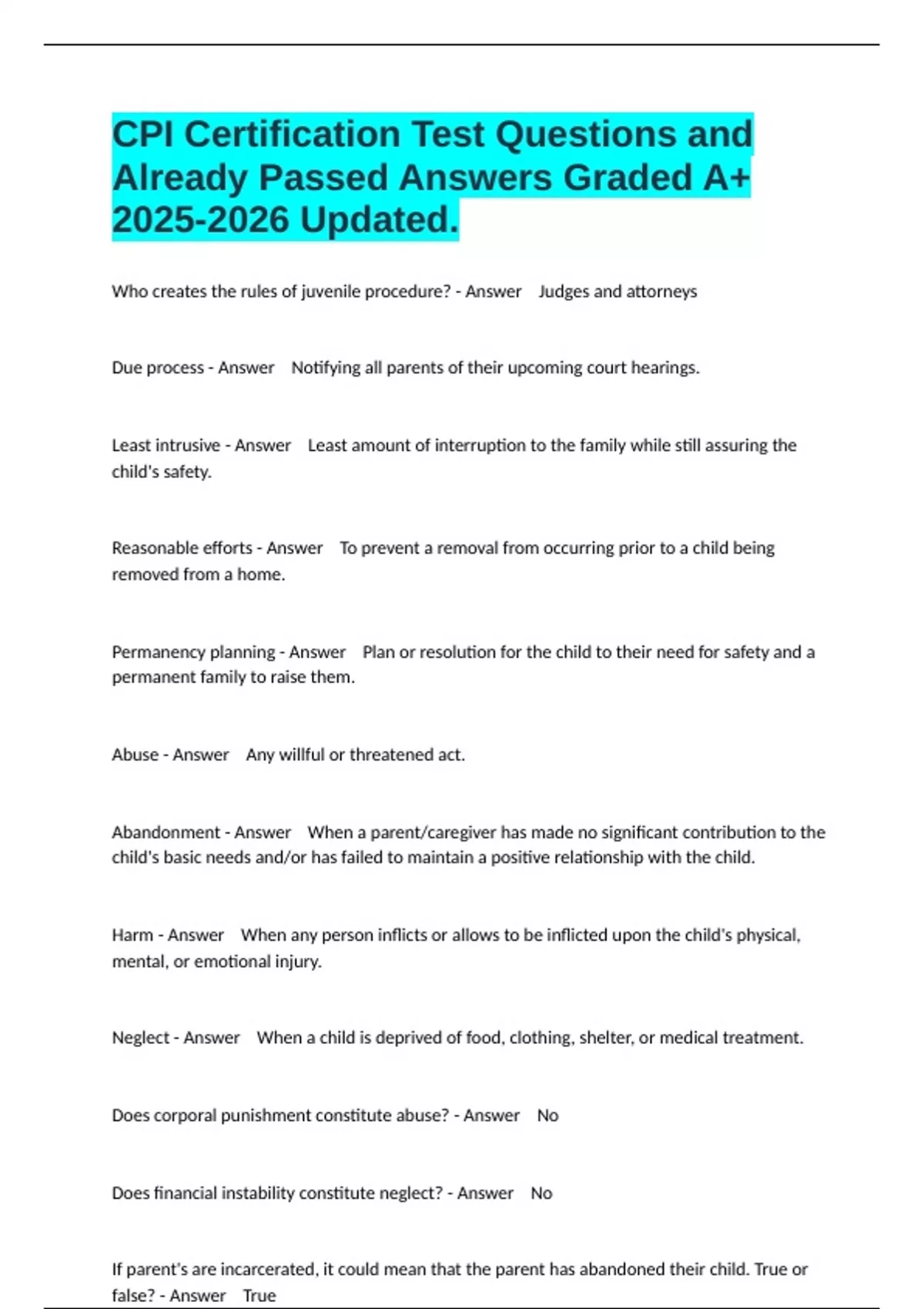 Who creates the rules of juvenile procedure? - Answer Judges and attorneys Due process - Answer Notifying all parents of their upcoming court hearings. Least intrusive - Answer Least amount of interruption to the family while still assuring the child's safety. Reasonable efforts - Answer To prevent a removal from occurring prior to a child being removed from a home. Permanency planning - Answer Plan or resolution for the child to their need for safety and a permanent family to raise them. Abuse - Answer Any willful or threatened act. Abandonment - Answer When a parent/caregiver has made no significant contribution to the child's basic needs and/or has failed to maintain a positive relationship with the child. Harm - Answer When any person inflicts or allows to be inflicted upon the child's physical, mental, or emotional injury. Neglect - Answer When a child is deprived of food, clothing, shelter, or medical treatment. Does corporal punishment constitute abuse? - Answer No Does financial instability constitute neglect? - Answer No If parent's are incarcerated, it could mean that the parent has abandoned their child. True or false? - Answer True An elementary school librarian must report their name when reporting child abuse. True or false? - Answer True
