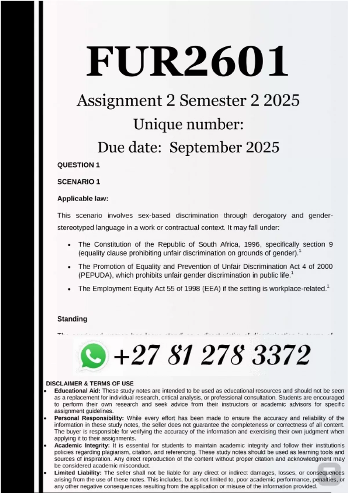 FUR2601 Assignment 2 (COMPLETE ANSWERS) Semester 2 2025 - DUE September 2025In respect of each of the four different scenarios below, you are required to consider whether they constitute fair discrimination; unfair discrimination; or another appropriate word/phrase or concept. Justify and explain your answer by addressing each of the four points below relating to each individual scenario: 1. Which of the following laws (if at all or more than one) is applicable in each scenario? (i) The Constitution of the Republic of South Africa, Act 200 of 1993; (ii) The Constitution of the Republic of South Africa, 1996; (iii) The Employment Equity Act 55 of 1998; (iv) The Promotion of Equality and Prevention of Unfair Discrimination Act 4 of 2000; 2. Does the aggrieved person(s) have standing (locus standi)? 3. Which court(s) has jurisdiction to adjudicate/decide the matter? 4. What remedies would be appropriate? Scenario 1: As a woman, there are a few words and phrases I hear about myself: “Aggressive”, for going after a promotion. “Controlling,” when I made household decisions. “Crazy,” by someone who didn’t like my attitude. “Difficult,” when I asked for more money when I had been contracted to perform a certain assignment. “Bitchy,” when I turned down another person’s idea. “Emotional” for raising my voice. “Hysterical” for getting angry, and a “stalker” for being persistent.1 Scenario 2: Caster Semenya is a person born with differences of sexual development (DSD). She is prohibited from competing in international sports activities with other women unless she takes medication to reduce her testosterone levels. Scenario 3: In recounting the Treason Trial during March 1960, Nelson Mandela referred to an incident where Justice Kennedy, a white man fluent in isiZulu responded with the words ‘Sinjalo thina maZulu’ (We Zulus are like that) in reference to one of Dr Wilson Conco’s medical achievements.2 Scenario 4: Michael was born male but has always identified as female. They began the process of gender reassignment about a year ago but has not told anyone about this. Recently she came to work dressed in a skirt, high heels, wearing make-up and a wig and informed everyone that they should be addressed as Michelle. Michelle was told to go home and change as she was embarrassing other staff members and clients. QUESTION 2 (8 marks) Discuss whether the statement below is true by relying on relevant authority, such as provisions of the law; reference to the prescribed study material;3 and case law. “Anyone seeking primary health care at any governmental medical facility in South Africa is required to produce their South African Identity Document. If the person does not possess a South Africa Identity Document, they are turned away from the facility, regardless of the circumstances”.