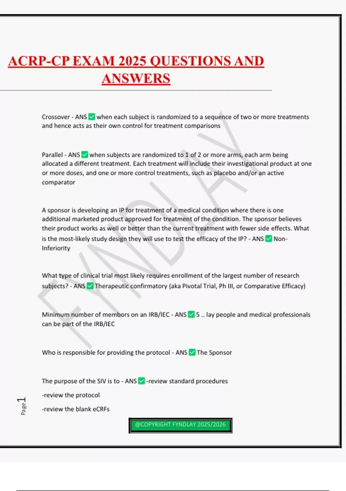 Crossover - ANS when each subject is randomized to a sequence of two or more treatments and hence acts as their own control for treatment comparisons Parallel - ANS when subjects are randomized to 1 of 2 or more arms, each arm being allocated a different treatment. Each treatment will include their investigational product at one or more doses, and one or more control treatments, such as placebo and/or an active comparator A sponsor is developing an IP for treatment of a medical condition where there is one additional marketed product approved for treatment of the condition. The sponsor believes their product works as well or better than the current treatment with fewer side effects. What is the most-likely study design they will use to test the efficacy of the IP? - ANS Non- Inferiority What type of clinical trial most likely requires enrollment of the largest number of research subjects? - ANS Therapeutic confirmatory (aka Pivotal Trial, Ph III, or Comparative Efficacy) Minimum number of membors on an IRB/IEC - ANS 5 .. lay people and medical professionals can be part of the IRB/IEC Who is responsible for providing the protocol - ANS The Sponsor The purpose of the SIV is to - ANS -review standard procedures -review the protocol -review the blank eCRFs ACRP-CP EXAM 2025 QUESTIONS AND ANSWERS @COPYRIGHT FYNDLAY 2025/2026 Page2 Minimum SAE reporting requirements - ANS - Subject details (ID not name) - IP - Interventions for the event that is being reported - Details of the event - Details on the reporter of the event - Admin and sponsor or company details/ Vulnerable subjects - ANS - Junior members of the medical profession - Employees of a pharmaceutical company - Military personnel - Pregnant Women - Prisoners IRB/IEC Evaluates - ANS - The rights, safety, and well-being of the subjects participating in the trial - The subject selection procedure - The scientific tenability of the trial Serious Adverse Event (SAE) - ANS - results in death, is life threatening, requires inpatient admission, prolonged admission, congenital anomaly, or persistent incapacity -death itself is not neccessarily an sae - Seriousness does not equal severity in that Serious requires reporting while severe may not.. Severe may just be used to describe an AE - Must be reported by sponsor to authorities within 15 calendars days from sponsors first knowledge of the