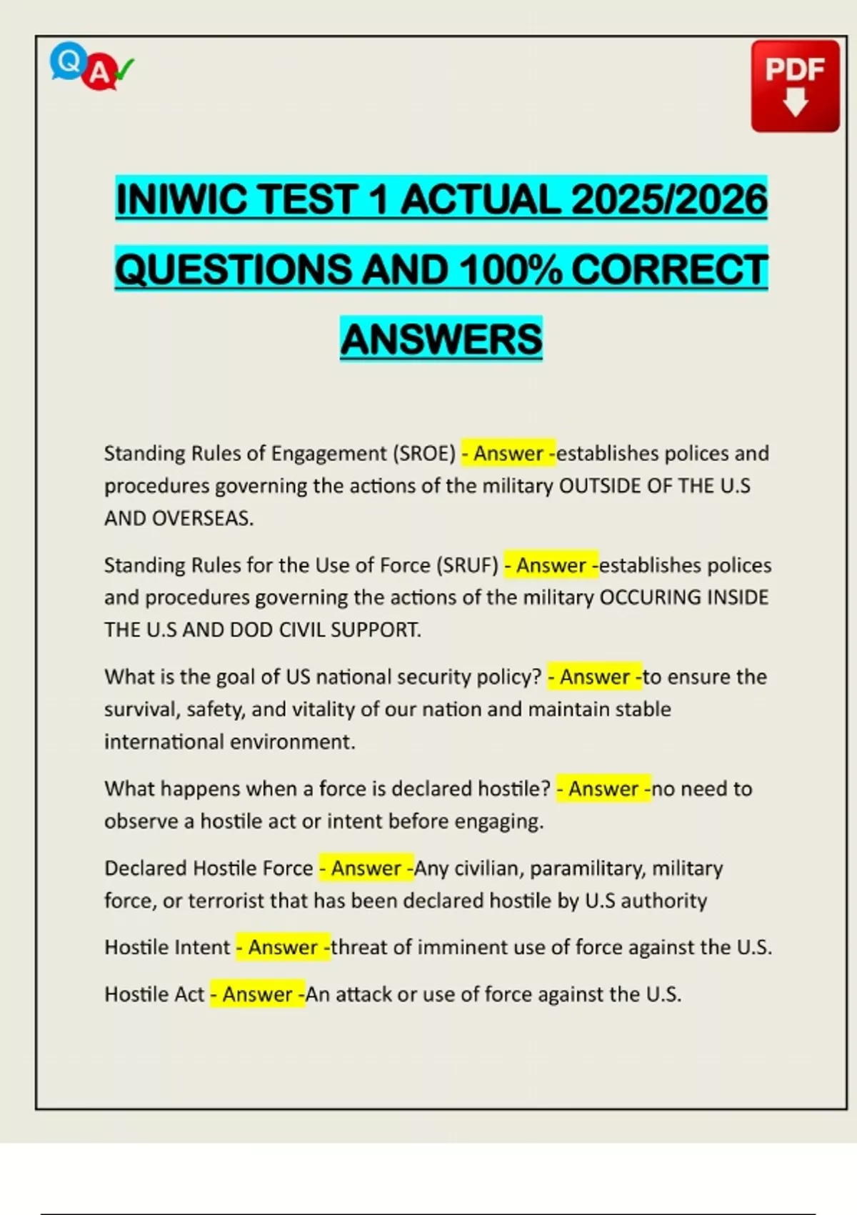 INIWIC TEST 1 ACTUAL 2025/2026 QUESTIONS AND 100% CORRECT ANSWERS Standing Rules of Engagement (SROE) - Answer -establishes polices and procedures governing the actions of the military OUTSIDE OF THE U.S AND OVERSEAS. Standing Rules for the Use of Force (SRUF) - Answer -establishes polices and procedures governing the actions of the military OCCURING INSIDE THE U.S AND DOD CIVIL SUPPORT. What is the goal of US national security policy? - Answer -to ensure the survival, safety, and vitality of our nation and maintain stable international environment. What happens when a force is declared hostile? - Answer -no need to observe a hostile act or intent before engaging. Declared Hostile Force - Answer -Any civilian, paramilitary, military force, or terrorist that has been declared hostile by U.S authority Hostile Intent - Answer -threat of imminent use of force against the U.S. Hostile Act - Answer -An attack or use