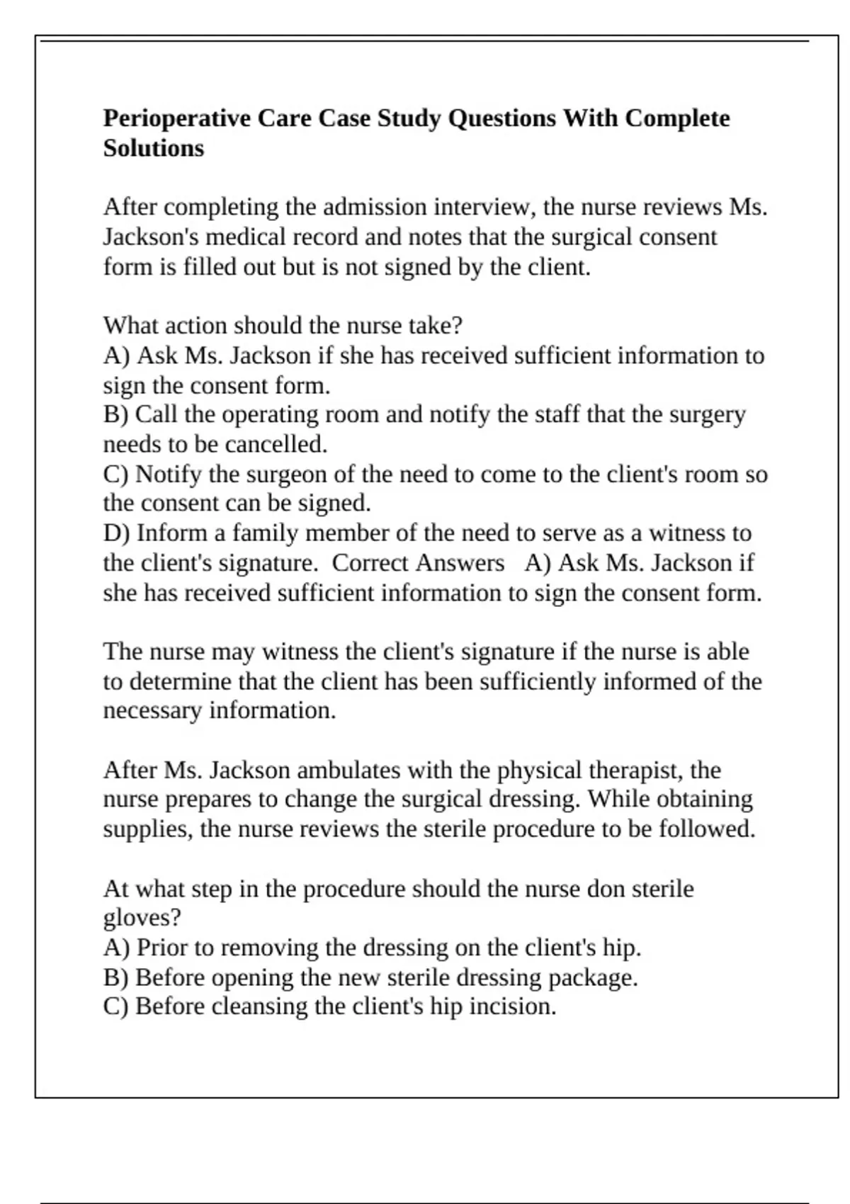 Perioperative Care Case Study Questions With Complete Solutions