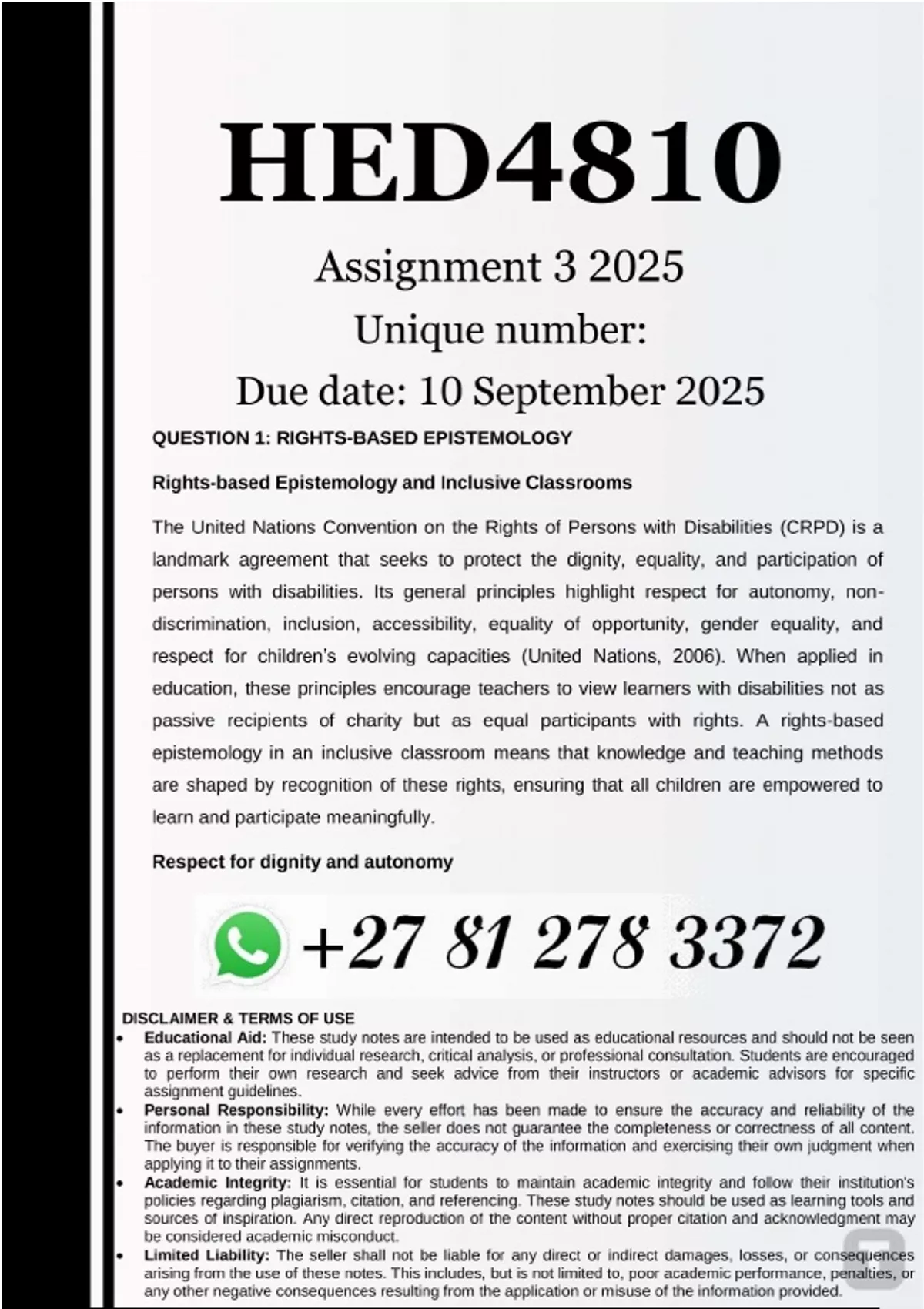 HED4810 Assignment 3 (COMPLETE ANSWERS) 2025 - DUE 10 September 2025... The purpose of Assignment 03 is to examine the barriers to the effective implementation of inclusive education and propose strategies to overcome these barriers. Please read Learning Unit 3 (lessons 9-14) to be able to answer the questions in this assignment. You are, however, not encouraged to copy and paste the contents of your study material. The online course content is meant only to guide you. You must read the recommended readings listed in Tutorial Letter 101 for HED4810. All readings for this module are open access. Your assignment must be presented as follows: • Cover page • Declaration of honesty • Contents page • All the responses to Assignment 03 (the numbering must correspond to that of the questions in this tutorial letter for Assignment 03) • List of references (all cited sources must appear as references in your list) When writing, you can use either the APA, 7th edition, or the Harvard referencing style, but you must be consistent with one referencing style of your choice. The module's learning outcomes are presented in section 4 below, followed by the assessment criteria used in this assignment. Remember that your assessments are guided by the assessment criteria, rather than what appears in your study guide, which is a resource to support your learning. 4. Learning outcomes The successful completion of this module will enable you to do the following: No. Outcomes 1 Actively participate in the current debates on inclusive education in South Africa. 2 Exhibit the skills and knowledge to conceptualise inclusive education in South Africa. 3 Apply inclusive education in different epistemologies and paradigms. 4 Define and describe Inclusive Education from an Afrocentric perspective. 5 Apply Inclusive Education practices in South African Context. ASSIGNMENT 03 HED. Assessment criteria for Assignment 03 Assignment 03 will be assessed according to the following criteria: No. Assessment criteria 1 Use different epistemologies and paradigms to explain inclusive education. 2 Apply social constructivism in IE practices. 3 Apply right-based epistemology to IE practices. 6. Due date for Assignment 03 Number Unique no. Format Percentage Due date Assignment Written (individual) 10% Wednesday, 10 September 2025, 11:00 PM ASSIGNMENT 03 HED. Assignment 03: Apply inclusive education in different epistemologies and paradigms Instructions: Answer all three questions. Follow the assessment rubric. Adhere to the due date. Include additional sources of information. Reference your work by citing the sources you have consulted and indicating them in your reference list. Rights-based Epistemology Discuss the human rights principles contained in the United Nations International Convention on the Rights of Persons with Disabilities (United Nations, 2006) in relation to how you would operationalise the rights-based epistemology in your inclusive classroom by giving three clear, practical examples, supported by three recent references. Inclusive education is based on the global Education for All (EFA) framework. Write an article for publication in your school’s D6 communicator entitled, “Promoting inclusion through education for all,”. Your discussion should include the following. How inclusive education responds to the EFA framework focused on (a) policy and (b) practice using the prescribed readings presented in Study Unit 1 (Lessons 1-4) on your module site. • Your recommendations for the effective implementation of the EFA framework in schools and classrooms. Remember: Your definition should be easy for all role players who use the D6 School Communicator to understand. Include at least five references in your answer. Your definition of Education for All should provide a critical synthesis of the scholarship (literature) on the “inclusive education” articulated in seminal texts, including the implementation of… the Bill of Rights (Chapter 2 of the Constitution of the Republic of South Africa, 1996) White Paper 6 on Special Needs Education: Building an Inclusive Education and Training System, First Steps (Department of Education, 2001). The Salamanca Statement (United Nations, 1994) and Programme of Action.Rights-based Epistemology Discuss the human rights principles contained in the United Nations International Convention on the Rights of Persons with Disabilities (United Nations, 2006) in relation to how you would operationalise the rights-based epistemology in your inclusive classroom by giving three clear, practical examples, supported by three recent references. Inclusive education is based on the global Education for All (EFA) framework. Write an article for publication in your school’s D6 communicator entitled, “Promoting inclusion through education for all,”. Your discussion should include the following. How inclusive education responds to the EFA framework focused on (a) policy and (b) practice using the prescribed readings presented in Study Unit 1 (Lessons 1-4) on your module site. • Your recommendations for the effective implementation of the EFA framework in schools and classrooms. Remember: Your definition should be easy for all role players who use the D6 School Communicator to understand. Include at least five references in your answer. Your definition of Education for All should provide a critical synthesis of the scholarship (literature) on the “inclusive education” articulated in seminal texts, including the implementation of… the Bill of Rights (Chapter 2 of the Constitution of the Republic of South Africa, 1996) White Paper 6 on Special Needs Education: Building an Inclusive Education and Training System, First Steps (Department of Education, 2001). The Salamanca Statement (United Nations, 1994) and Programme of Action. To accommodate the diverse needs of all their learners, teachers need to collaborate with their school-based support teams and district-based support te