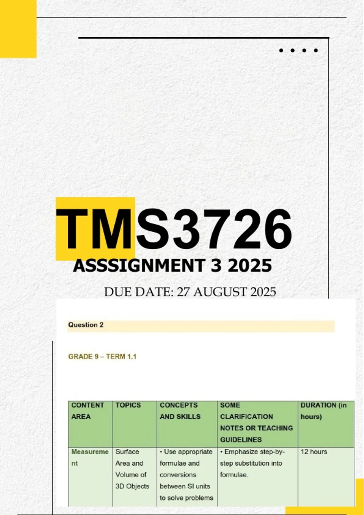 This TMS3726 Assignment 3 (2025) provides a detailed Grade 9 Mathematics lesson plan aligned with the CAPS curriculum. It focuses on measurement of surface area, volume, and capacity of 3D objects, with clear strategies for teaching, learning, and assessment in the senior phase. Key aspects include: Forum Participation (Q1): Reflection and engagement in online discussions, demonstrating peer-to-peer learning. Content Knowledge (Q2): Application of formulae for cubes, rectangular prisms, triangular prisms, and cylinders, with emphasis on correct unit conversions (