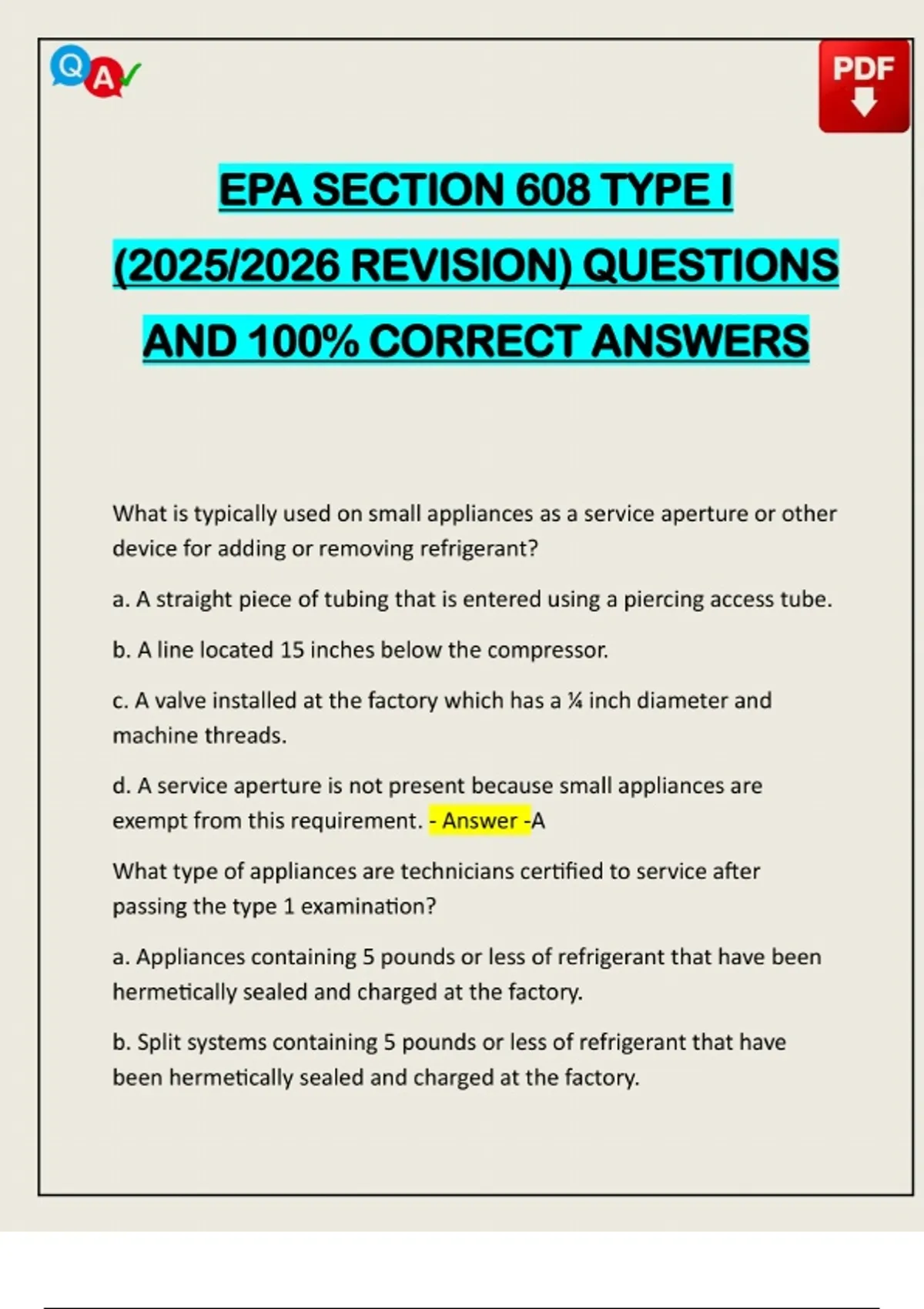 EPA SECTION 608 TYPE I (2025/2026 REVISION) QUESTIONS AND 100% CORRECT ANSWERS What is typically used on small appliances as a service aperture or other device for adding or removing refrigerant? a. A straight piece of tubing that is entered using a piercing access tube. b. A line located 15 inches below the compressor. c. A valve installed at the factory which has a ¼ inch diameter and machine threads. d. A service aperture is not present because small appliances are exempt from this requirement. - Answer -A What type of appliances are technicians certified to service after passing the type 1 examination? a. Appliances containing 5 pounds or less of refrigerant that have been hermetically sealed and charged at the factory. b. Split systems containing 5 pounds or less of refrigerant that have been hermetically sealed and charged at the factory.Need assistance in Online classes, Exams & Assignments? Reach out for Full Course Assistance, Plagiarism-free Essay Writing, Research Paper & Discussion Posts. Confidential & Secure! Email now at: c. Appliances containing 5 pounds or less of refrigerant that have an open drive compressor and have been charged at the factory. d. Motor vehicle air conditioning equipment. - Answer -A What type of certification is required for persons recovering CFC's, HCFCs, or HFCs during maintenance, service, or repair of small appliances. a. Type II technician. b. Type III technician.