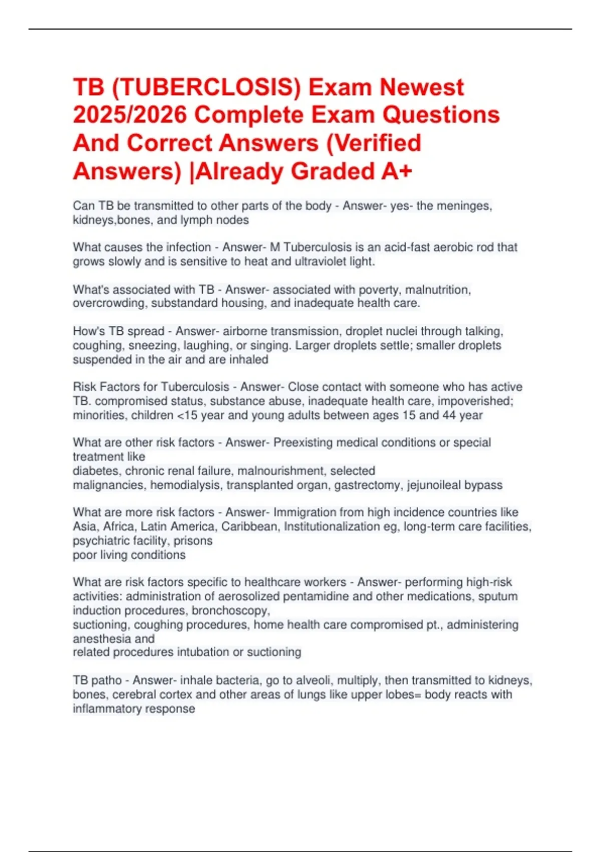 Risk Factors for Tuberculosis - Answer- Close contact with someone who has active