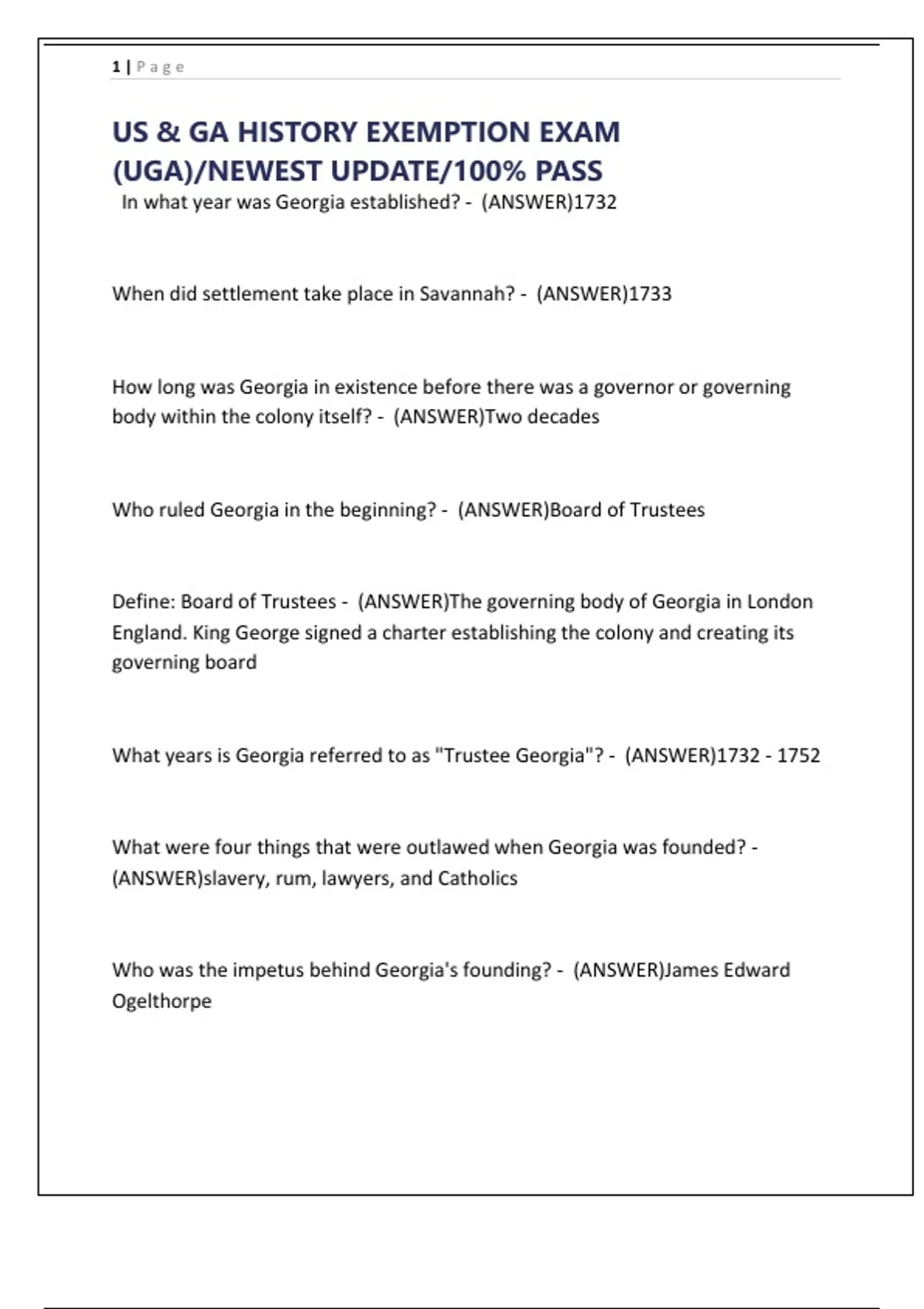 US & GA HISTORY EXEMPTION EXAM (UGA)/NEWEST UPDATE/100% PASS