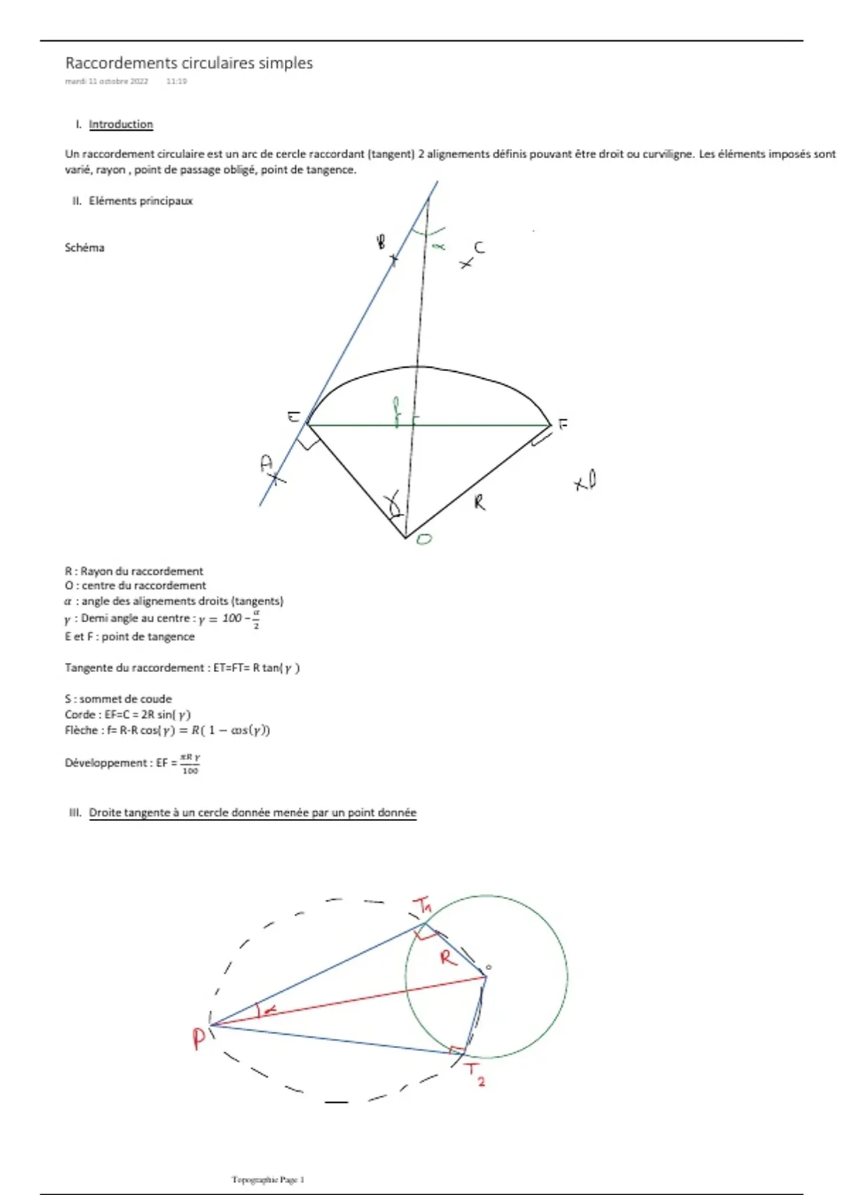 Un raccordement circulaire est un arc de cercle raccordant (tangent) 2 alignements définis pouvant être droit ou curviligne. Les éléments imposés sont
