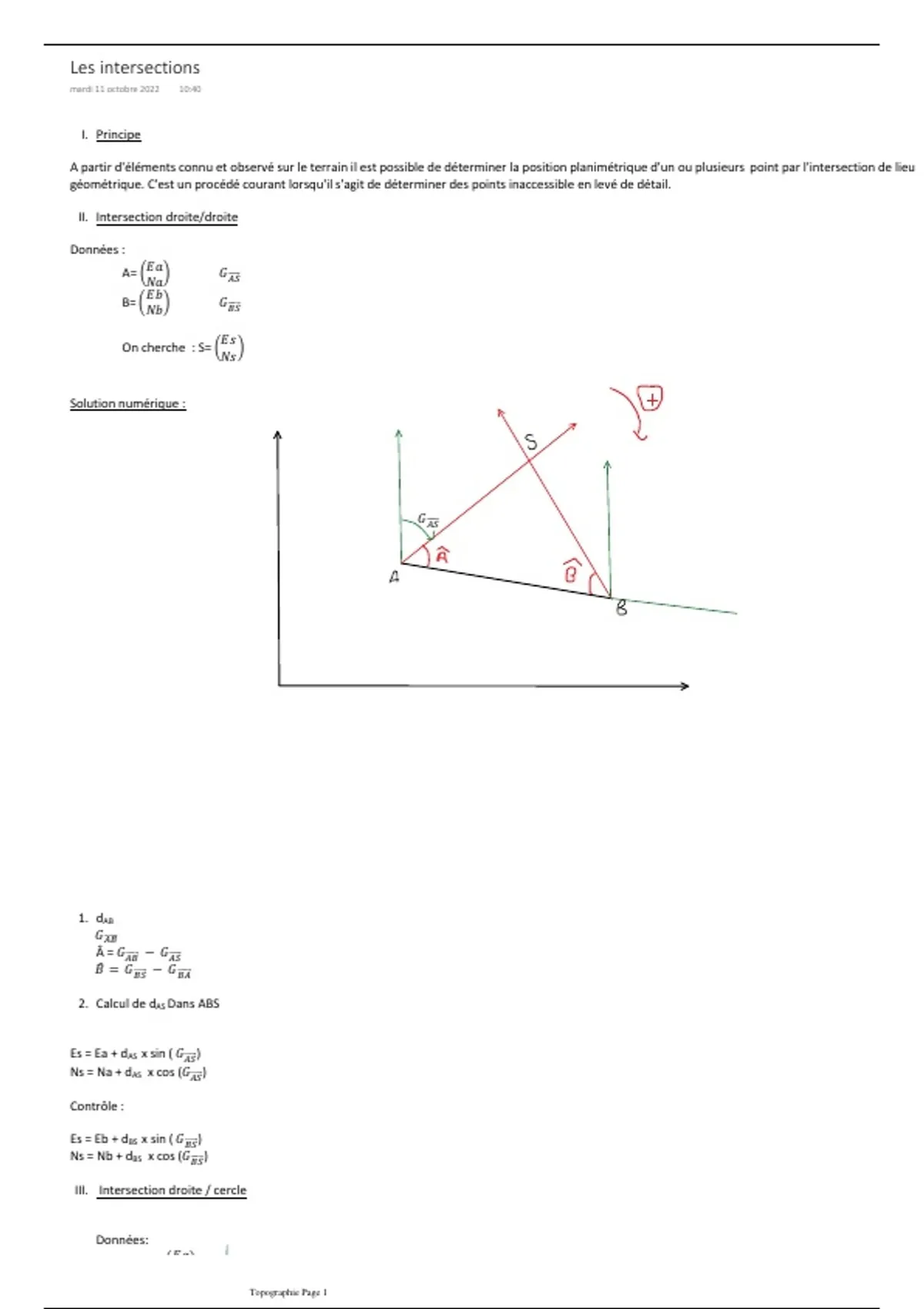 A partir d'éléments connu et observé sur le terrain il est possible de déterminer la position planimétrique d'un ou plusieurs point par l'intersection de lieu géométrique. C'est un procédé courant lorsqu'il s'agit de déterminer des points inaccessible en levé de détail.
