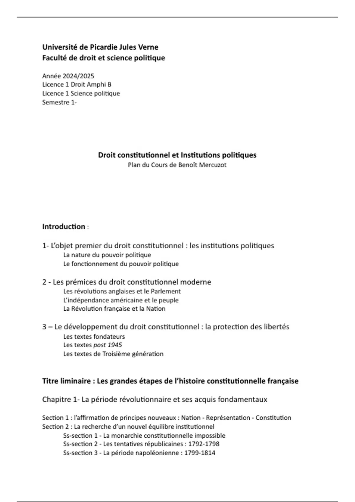 Plan du Cours de Benoît Mercuzot