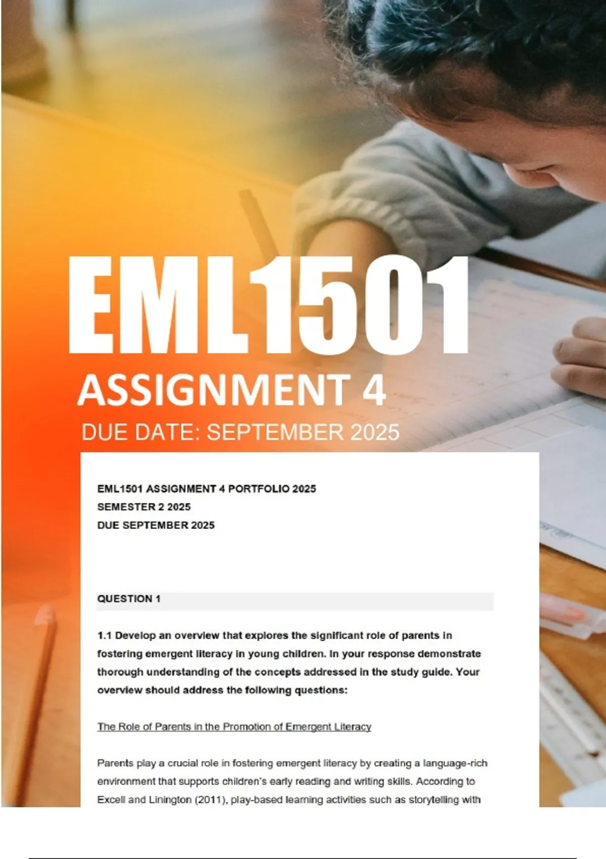 EML1501 Assignment 4 PORTFOLIO Semester 2 2025 - Due September 2025. EML1501 ASSIGNMENT 4 PORTFOLIO 2025 SEMESTER 2 2025 DUE SEPTEMBER 2025 QUESTION 1 1.1 Develop an overview that explores the significant role of parents in fostering emergent literacy in young children. In your response demonstrate thorough understanding of the concepts addressed in the study guide. Your overview should address the following questions: The Role of Parents in the Promotion of Emergent Literacy Parents play a crucial role in fostering emergent literacy by creating a language-rich environment that supports children’s early reading and writing skills. According to Excell and Linington (2011), play-based learning activities such as storytelling with puppets, sequencing pictures, and interactive alphabet games provide opportunities for children to connect spoken and written language. Parents can read alphabet books, point out letters in the environment, and encourage children to explore sounds and shapes of letters in everyday activities. Such as modelling reading and writing behaviours, parents demonstrate that literacy is both meaningful and enjoyable, thereby laying the foundation for successful language acquisition.