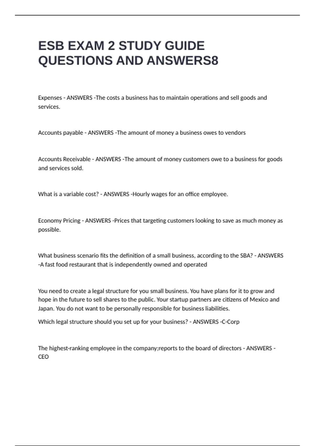 ESB EXAM 2 STUDY GUIDE QUESTIONS AND ANSWERS Expenses - ANSWERS -The costs a business has to maintain operations and sell goods and services. Accounts payable - ANSWERS -The amount of money a business owes to vendors Accounts Receivable - ANSWERS -The amount of money customers owe to a business for goods and services sold. What is a variable cost? - ANSWERS -Hourly wages for an office employee. Economy Pricing - ANSWERS -Prices that targeting customers looking to save as much money as possible. What business scenario fits the definition of a small business, according to the SBA? - ANSWERS -A fast food restaurant that is independently owned and operated You need to create a legal structure for you small business. You have plans for it to grow and hope in the future to sell shares to the public. Your startup partners are citizens of Mexico and Japan. You do not want to be personally responsible for business liabilities. Which legal structure should you set up for your business? - ANSWERS -C-Corp The highest-ranking employee in the company;reports to the board of directors - ANSWERS -CEO