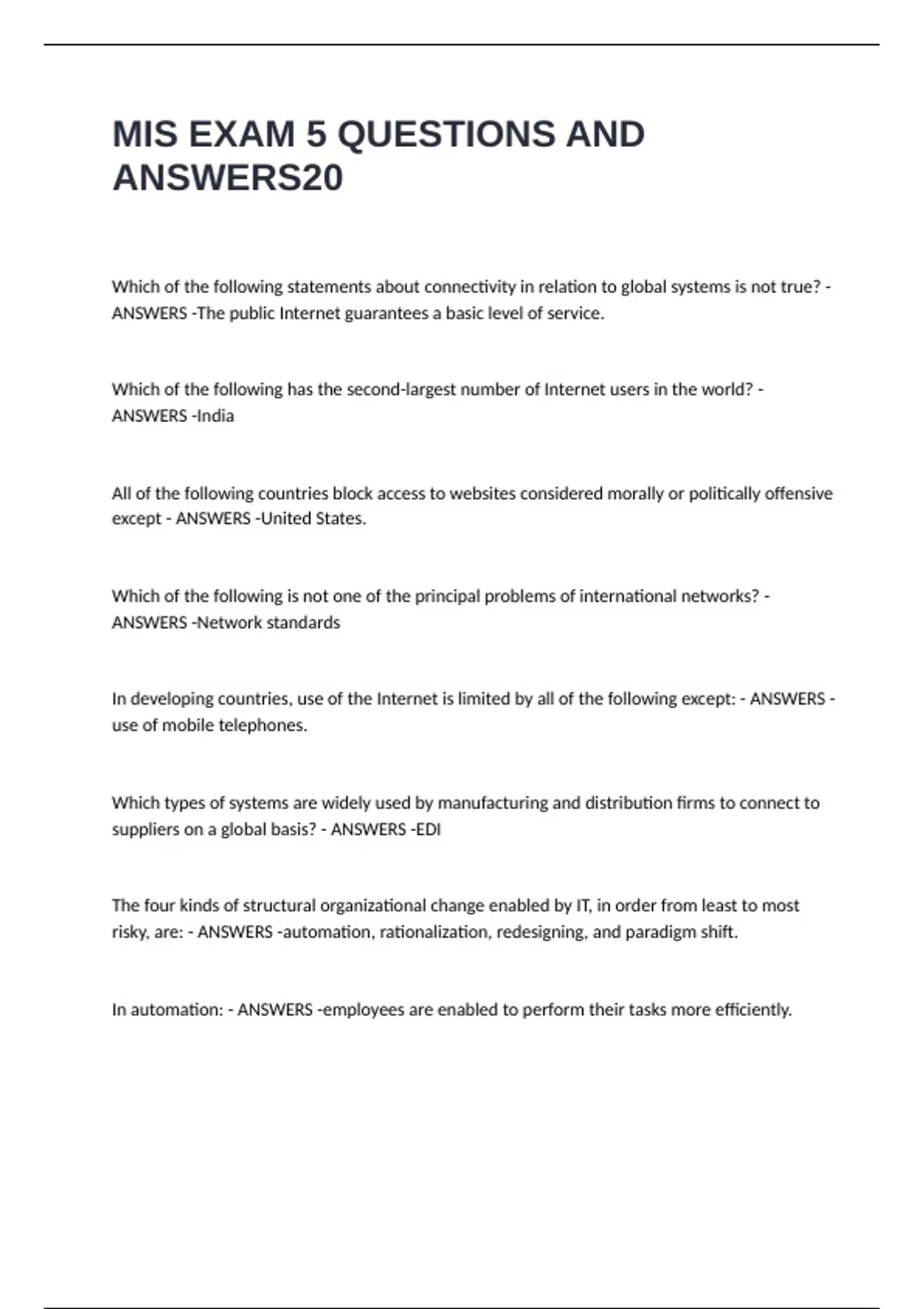 MIS EXAM 5 QUESTIONS AND ANSWERS Which of the following statements about connectivity in relation to global systems is not true? - ANSWERS -The public Internet guarantees a basic level of service. Which of the following has the second-largest number of Internet users in the world? - ANSWERS -India All of the following countries block access to websites considered morally or politically offensive except - ANSWERS -United States. Which of the following is not one of the principal problems of international networks? - ANSWERS -Network standards In developing countries, use of the Internet is limited by all of the following except: - ANSWERS -use of mobile telephones. Which types of systems are widely used by manufacturing and distribution firms to connect to suppliers on a global basis? - ANSWERS -EDI The four kinds of structural organizational change enabled by IT, in order from least to most risky, are: - ANSWERS -automation, rationalization, redesigning, and paradigm shift. In automation: - ANSWERS -employees are enabled to perform their tasks more efficiently.