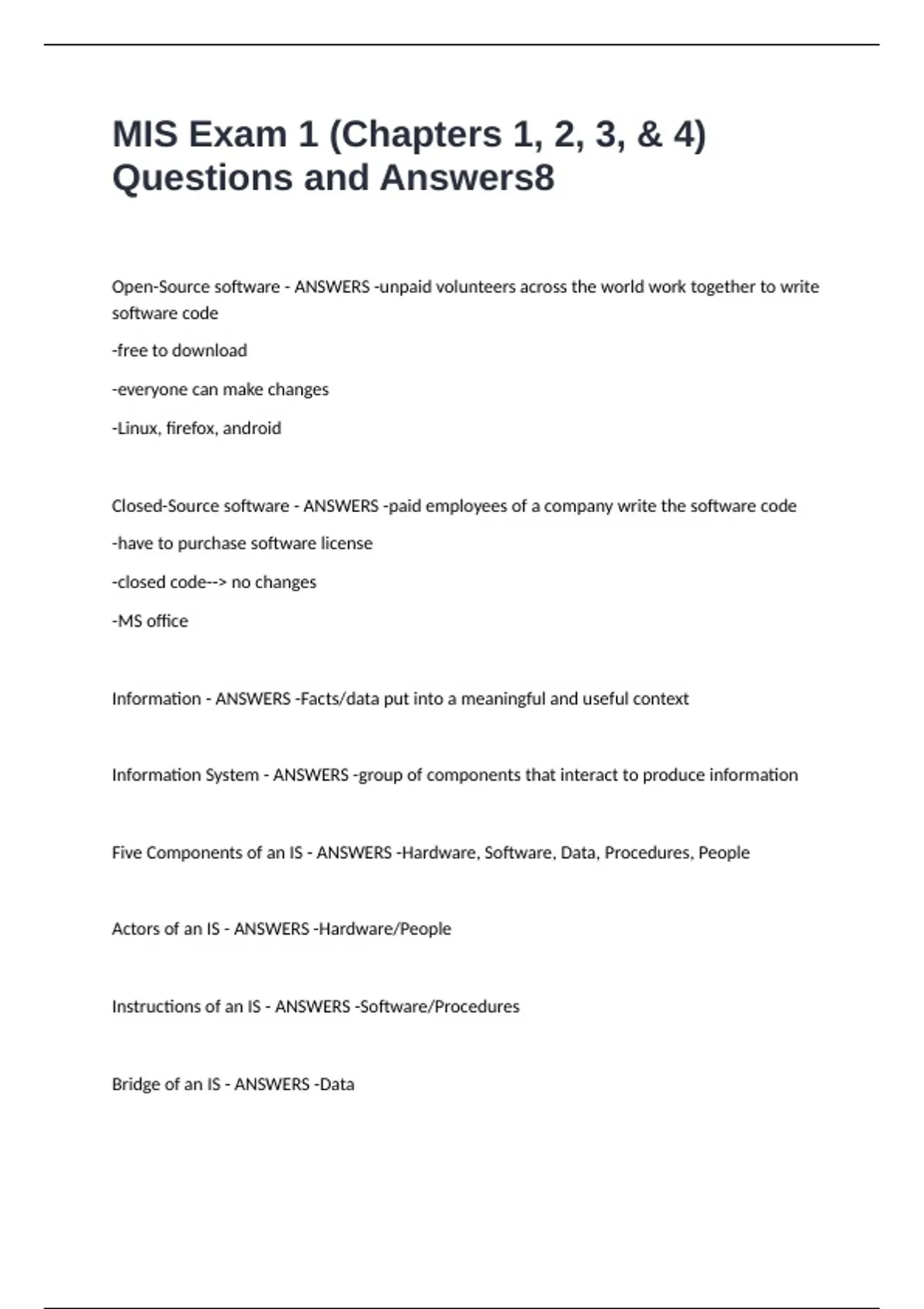 Five Components of an IS - ANSWERS -Hardware, Software, Data, Procedures, People