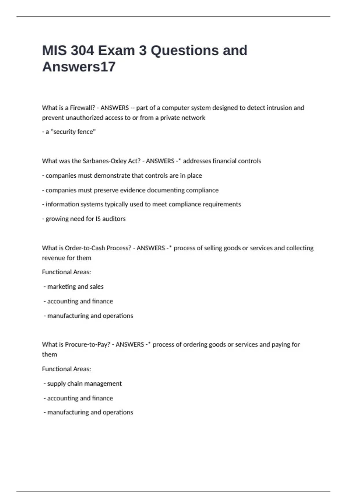MIS 304 Exam 3 Questions and Answers What is a Firewall? - ANSWERS -- part of a computer system designed to detect intrusion and prevent unauthorized access to or from a private network - a "security fence" What was the Sarbanes-Oxley Act? - ANSWERS -* addresses financial controls - companies must demonstrate that controls are in place - companies must preserve evidence documenting compliance - information systems typically used to meet compliance requirements - growing need for IS auditors What is Order-to-Cash Process? - ANSWERS -* process of selling goods or services and collecting revenue for them Functional Areas: - marketing and sales - accounting and finance - manufacturing and operations What is Procure-to-Pay? - ANSWERS -* process of ordering goods or services and paying for them Functional Areas: - supply chain management - accounting and finance - manufacturing and operations