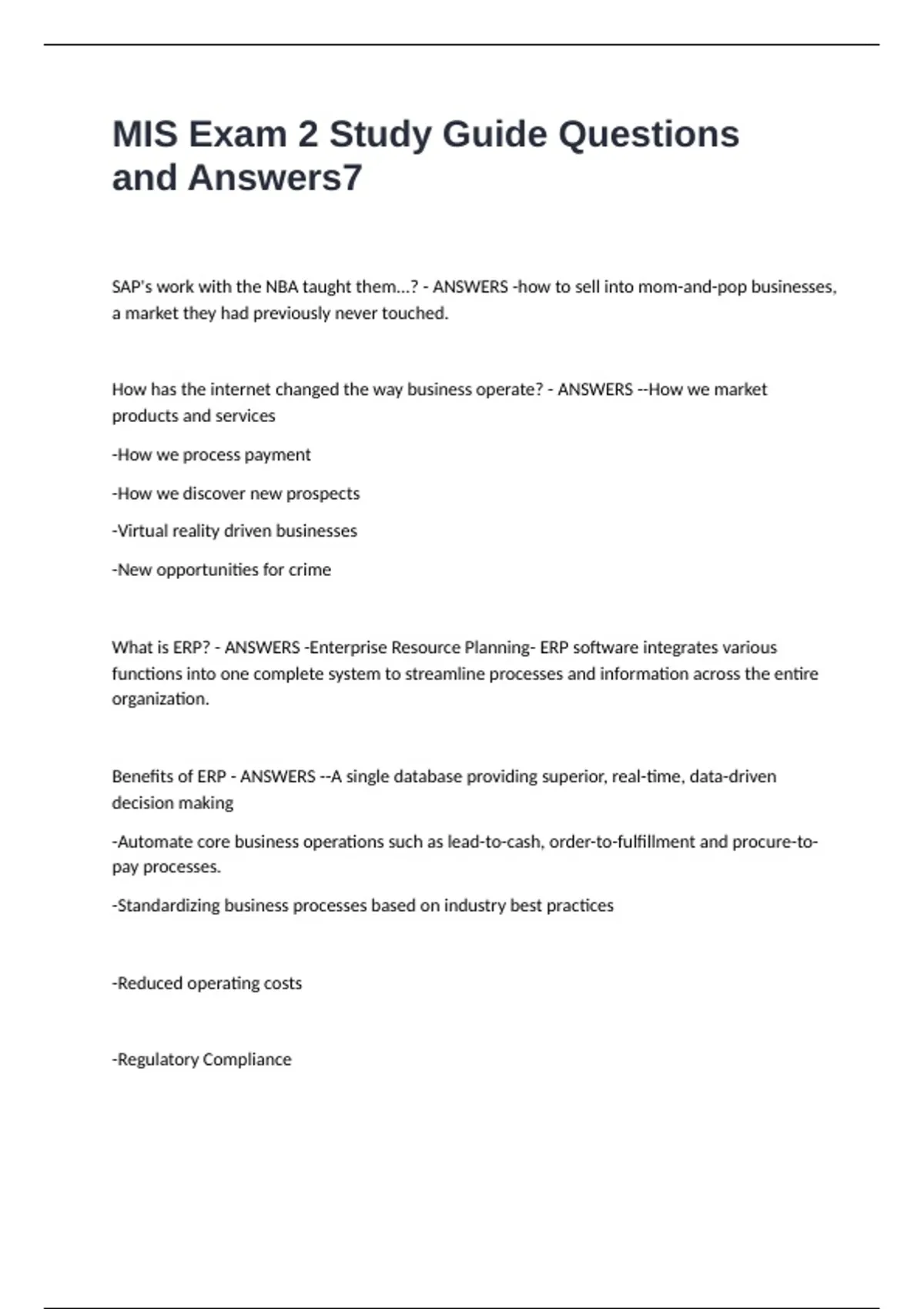 MIS Exam 2 Study Guide Questions and Answers SAP's work with the NBA taught them...? - ANSWERS -how to sell into mom-and-pop businesses, a market they had previously never touched. How has the internet changed the way business operate? - ANSWERS --How we market products and services -How we process payment -How we discover new prospects -Virtual reality driven businesses -New opportunities for crime What is ERP? - ANSWERS -Enterprise Resource Planning- ERP software integrates various functions into one complete system to streamline processes and information across the entire organization. Benefits of ERP - ANSWERS --A single database providing superior, real-time, data-driven decision making -Automate core business operations such as lead-to-cash, order-to-fulfillment and procure-to-pay processes. -Standardizing business processes based on industry best practices -Reduced operating costs -Regulatory Compliance