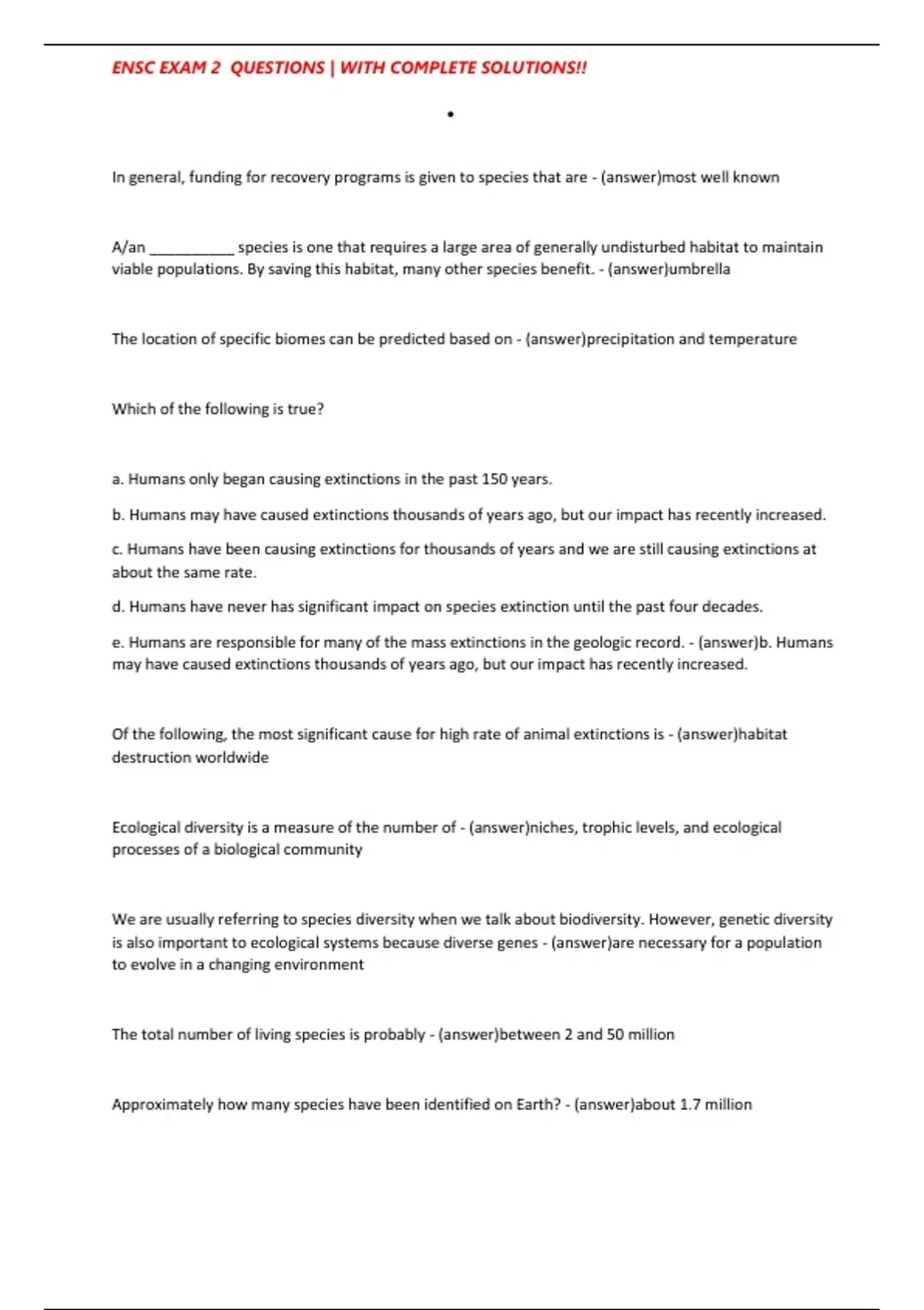 e. Humans are responsible for many of the mass extinctions in the geologic record. - (answer)b. Humans