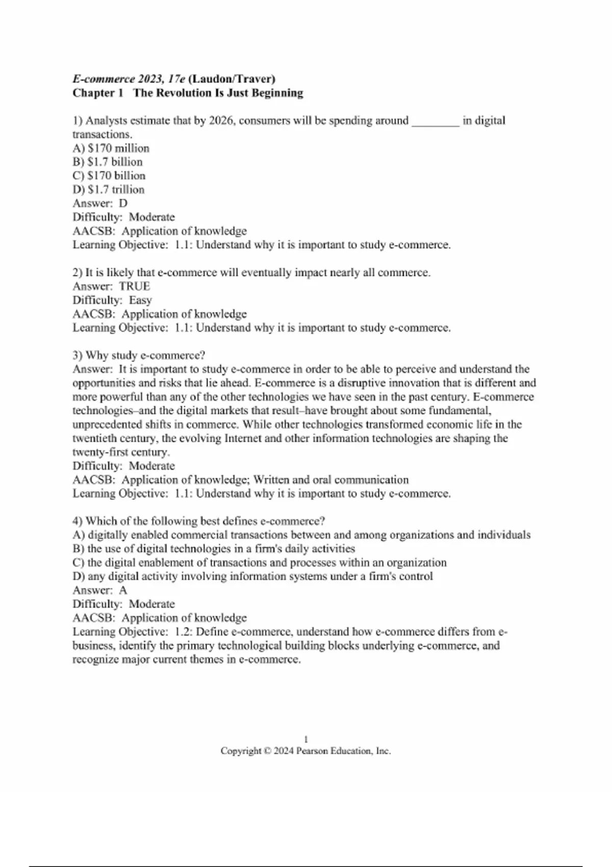 Test Bank for E-Commerce 2023: Business, Technology, Society, 17th edition 17e by Kenneth C. Laudon, Carol Guercio Traver. ISBN 2208 Full Chapters test bank included PART I: INTRODUCTION TO E-COMMERCE The Revolution is Just Beginning E-commerce Business Models and Concepts PART II: TECHNOLOGY INFRASTRUCTURE FOR E-COMMERCE E-commerce Infrastructure: The Internet, the Web, and the Mobile Platform Building an E-commerce Presence: Websites, Mobile Sites, and Apps E-commerce Security and Payment Systems PART III: BUSINESS CONCEPTS AND SOCIAL ISSUES E-commerce Marketing and Advertising Concepts Social, Mobile, and Local Marketing Ethical, Social, and Political Issues in E-commerce PART VI: E-COMMERCE IN ACTION Online Retail and Services Online Content and Media Social Networks, Auctions, and Portals B2B E-commerce: Supply Chain Management and Collaborative Commerce