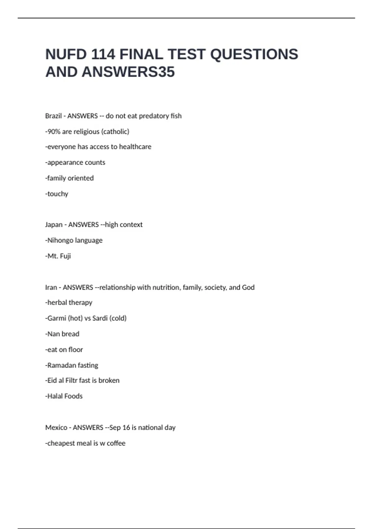 NUFD 114 FINAL TEST QUESTIONS AND ANSWERS Brazil - ANSWERS -- do not eat predatory fish -90% are religious (catholic) -everyone has access to healthcare -appearance counts -family oriented -touchy Japan - ANSWERS --high context -Nihongo language -Mt. Fuji Iran - ANSWERS --relationship with nutrition, family, society, and God -herbal therapy -Garmi (hot) vs Sardi (cold) -Nan bread -eat on floor -Ramadan fasting -Eid al Filtr fast is broken -Halal Foods Mexico - ANSWERS --Sep 16 is national day -cheapest meal is w coffee