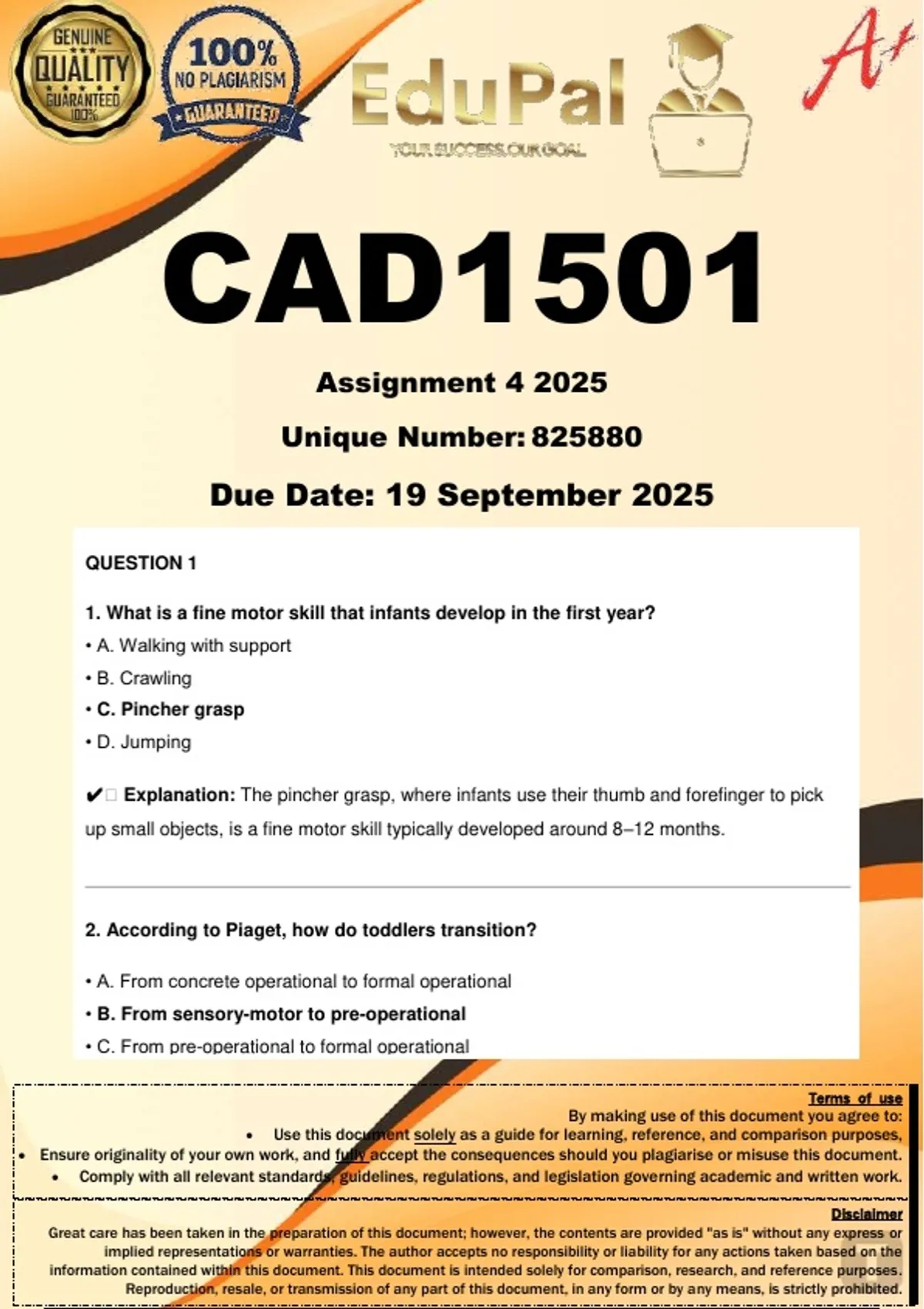CAD1501 Assignment 4 (COMPLETE ANSWERS) 2025 - DUE 19 September 2025; 100% TRUSTED Complete, trusted solutions and explanations. For assistance, Whats-App 0.6.7-1.7.1-1.7.3.9. Ensure your success with us.. Questions 1 [20 marks] 1.1 What is your understanding of the following domains of development? Indicate the study guide sections and give numbers where you found the theory for your answer. [8 marks] 1.1.1 Cognitive domain 1.1.2 Physical domain 1.1.3 Social domain 1.1.4 Emotional domain 1.2 Give examples of how these domains are displayed in children between 6 and 12 years. Emotional development includes learning to express and control feelings. 1.2.2 Social identity refers to how a child sees themselves as part of a group. 1.2.3 Nature refers to the environment in which a child grows up. 1.2.4 Environmental factors cause genetic disorders like Down syndrome. 1.2.5 Bandura's concept of self-efficacy relates to a person's belief in their ability to succeed. 1.3 What were the key influences or the key people that shaped your moral/normative development? Explain whether they were good or bad influences and justify your answer. [4 marks] Domain Description of the domain How the domain is displayed in children aged 6-12 years Indicate the study guide sections and give numbers where you found the theory for your answer 1.1.1 Cognitive domain Allocate two marks each for the explanation of the domain. Maximum of 8 marks 1.2 Allocate one mark for the correct activity that demonstrates the domain by children. Maximum of 4 marks 1 mark for section number and page number (give both for 1 mark) Maximum of 4 marks 1.1.2 Physical domain 1.1.3 Social domain 1.1.4 Emotional domain Total = 16 marks QUESTION 1 16 MARKS Explain the following concepts/terms in your own words and indicate the study guide’s section and page numbers where you found the theory for answering this question. 1.1 Sensory-motor skills 1.2 Operations 1.3 Private speech 1.4 Puberty (Tip: Do not repeat the same facts all over again. Write at least five (5) different facts for three (3) marks. This will help you to obtain full marks. The term “own words” does not mean own opinion. You need to paraphrase/reword the study guide by using your own words. Your answer must be factually correct. No marks will be given for cutting and pasting or word-for-word copying from the study guide and/or any other source.) 5 Amina is very attached to her grandmother and cries when she leaves. She has started using two-word sentences like "Mama gone" and "More food." She plays next to other children but does not yet engage in cooperative play. She throws tantrums when frustrated and struggles to share toys. 2.1 Identify Amina's physical, cognitive and language developmental milestones. (6 marks) 2.2 How does her cultural environment support her development? (3 marks) 2.3 What strategies could help Amina develop better emotional regulation? (2 marks) 2.4 Describe how toddlers' emotional and social development prepares them for preschool. (4 marks) Domain What were the key influences Who were the people involved, and how Evaluate if they were good or bad influences 1.3 Moral/normative development Explain in your own words how you became aware or formed your moral development. Demonstrate that you understand the moral and normative domains. Maximum two marks for showing understanding of a moral issue. Give a relevant account on how these individuals or people shaped your moral view. Award 1 mark for showing how the person shaped moral development Reflect on whether they were a good or bad influence on you based on your current moral standards. (NB: please note there is no moral judgment, just a reflection activity) Award 1 mark for sound evaluation. Total = 4 marks 3.1 Analyse the role of peer groups in shaping social development during middle childhood. (5 marks) 3.2 Identify three risk factors that hinder adolescent development. (6 marks) 3.3 Evaluate two consequences of teenage pregnancy and HIV/Aids on adolescent development. Question 2 [18 marks] Which theorist and theory aligns with the following statement? Justify your response by elaborating on why you think the statement is important for us to understand child development. Cite references for your work. 2.1 Schemas help explain how children learn through experience by allowing them to assimilate new information into existing schemas and accommodate new information by modifying schemas. 2.2 Learning occurs through interactions with more knowledgeable others, such as parents, teachers, and peers, and language and culture are essential tools for cognitive development. 2.3 Children learn by observing the behaviour of others and the consequences of those behaviours. 2.4 Children develop a sense of initiative and confidence in their ability to take on new tasks and challenges. 2.5 The child does not develop according to fixed ages, but rather according to readiness to perform a certain task. 2.6 Human development is influenced by the link between satisfying basic needs and development or growth needs. Statement State Theorist State Theory Provide a Justification Referencing Write the statement in full and make a table to present your answer. Mention the theorist who aligns with the statement. Award ½ mark for mentioning the correct theorist Mention the theory that aligns with the statement Award 1 mark for mentioning the correct theory in full Justify why the statement is important for advancing our understanding of child development. You could explain the rationale behind the theory and why the statement is true, considering the assumptions that underpin it. You could also refer to the section that confirms the statement. Award 1 mark for the justification Award 1/2 mark for consistent referencing for each section Total = 3 6 6 3 Question 3 [12 marks] 3.1 Numerous risk factors can affect the holistic development of orphans and vulnerable children in our communities. Identify the 6 (six) risk fact