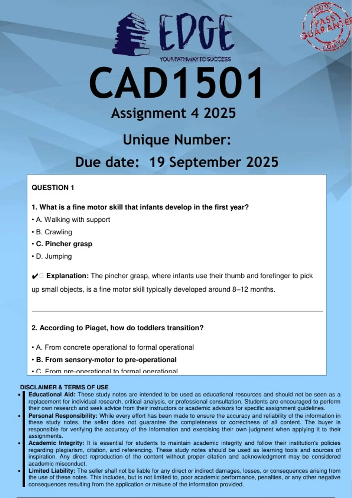 Well-structured CAD1501 Assignment 4 (ANSWERS) 2025 - DISTINCTION GUARANTEED. (DETAILED ANSWERS - DISTINCTION GUARANTEED!)..... Questions 1 [20 marks] 1.1 What is your understanding of the following domains of development? Indicate the study guide sections and give numbers where you found the theory for your answer. [8 marks] 1.1.1 Cognitive domain 1.1.2 Physical domain 1.1.3 Social domain 1.1.4 Emotional domain 1.2 Give examples of how these domains are displayed in children between 6 and 12 years. Emotional development includes learning to express and control feelings. 1.2.2 Social identity refers to how a child sees themselves as part of a group. 1.2.3 Nature refers to the environment in which a child grows up. 1.2.4 Environmental factors cause genetic disorders like Down syndrome. 1.2.5 Bandura's concept of self-efficacy relates to a person's belief in their ability to succeed. 1.3 What were the key influences or the key people that shaped your moral/normative development? Explain whether they were good or bad influences and justify your answer. [4 marks] Domain Description of the domain How the domain is displayed in children aged 6-12 years Indicate the study guide sections and give numbers where you found the theory for your answer 1.1.1 Cognitive domain Allocate two marks each for the explanation of the domain. Maximum of 8 marks 1.2 Allocate one mark for the correct activity that demonstrates the domain by children. Maximum of 4 marks 1 mark for section number and page number (give both for 1 mark) Maximum of 4 marks 1.1.2 Physical domain 1.1.3 Social domain 1.1.4 Emotional domain Total = 16 marks QUESTION 1 16 MARKS Explain the following concepts/terms in your own words and indicate the study guide’s section and page numbers where you found the theory for answering this question. 1.1 Sensory-motor skills 1.2 Operations 1.3 Private speech 1.4 Puberty (Tip: Do not repeat the same facts all over again. Write at least five (5) different facts for three (3) marks. This will help you to obtain full marks. The term “own words” does not mean own opinion. You need to paraphrase/reword the study guide by using your own words. Your answer must be factually correct. No marks will be given for cutting and pasting or word-for-word copying from the study guide and/or any other source.) 5 Amina is very attached to her grandmother and cries when she leaves. She has started using two-word sentences like "Mama gone" and "More food." She plays next to other children but does not yet engage in cooperative play. She throws tantrums when frustrated and struggles to share toys. 2.1 Identify Amina's physical, cognitive and language developmental milestones. (6 marks) 2.2 How does her cultural environment support her development? (3 marks) 2.3 What strategies could help Amina develop better emotional regulation? (2 marks) 2.4 Describe how toddlers' emotional and social development prepares them for preschool. (4 marks) Domain What were the key influences Who were the people involved, and how Evaluate if they were good or bad influences 1.3 Moral/normative development Explain in your own words how you became aware or formed your moral development. Demonstrate that you understand the moral and normative domains. Maximum two marks for showing understanding of a moral issue. Give a relevant account on how these individuals or people shaped your moral view. Award 1 mark for showing how the person shaped moral development Reflect on whether they were a good or bad influence on you based on your current moral standards. (NB: please note there is no moral judgment, just a reflection activity) Award 1 mark for sound evaluation. Total = 4 marks 3.1 Analyse the role of peer groups in shaping social development during middle childhood. (5 marks) 3.2 Identify three risk factors that hinder adolescent development. (6 marks) 3.3 Evaluate two consequences of teenage pregnancy and HIV/Aids on adolescent development. Question 2 [18 marks] Which theorist and theory aligns with the following statement? Justify your response by elaborating on why you think the statement is important for us to understand child development. Cite references for your work. 2.1 Schemas help explain how children learn through experience by allowing them to assimilate new information into existing schemas and accommodate new information by modifying schemas. 2.2 Learning occurs through interactions with more knowledgeable others, such as parents, teachers, and peers, and language and culture are essential tools for cognitive development. 2.3 Children learn by observing the behaviour of others and the consequences of those behaviours. 2.4 Children develop a sense of initiative and confidence in their ability to take on new tasks and challenges. 2.5 The child does not develop according to fixed ages, but rather according to readiness to perform a certain task. 2.6 Human development is influenced by the link between satisfying basic needs and development or growth needs. Statement State Theorist State Theory Provide a Justification Referencing Write the statement in full and make a table to present your answer. Mention the theorist who aligns with the statement. Award ½ mark for mentioning the correct theorist Mention the theory that aligns with the statement Award 1 mark for mentioning the correct theory in full Justify why the statement is important for advancing our understanding of child development. You could explain the rationale behind the theory and why the statement is true, considering the assumptions that underpin it. You could also refer to the section that confirms the statement. Award 1 mark for the justification Award 1/2 mark for consistent referencing for each section Total = 3 6 6 3 Question 3 [12 marks] 3.1 Numerous risk factors can affect the holistic development of orphans and vulnerable children in our communities. Identify the 6 (six) risk factors and explain how you, as a student of child and adolescent development, can