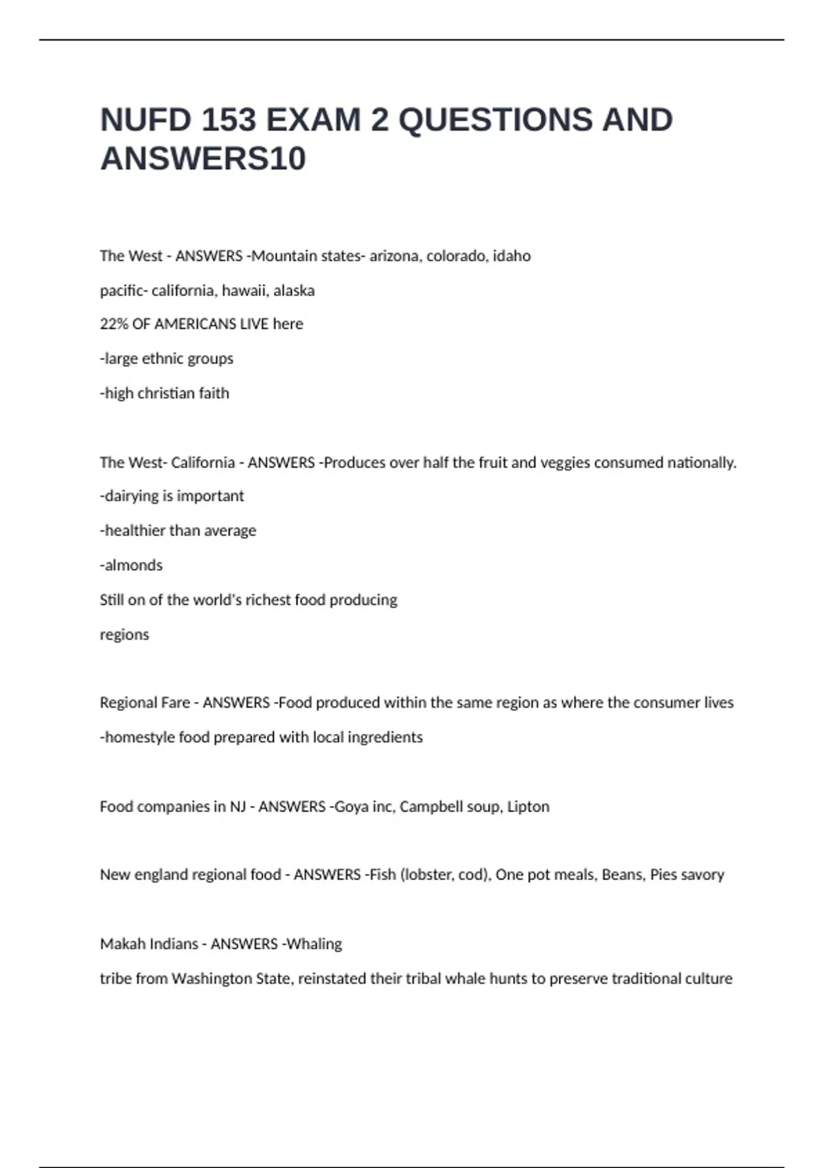 NUFD 153 EXAM 2 QUESTIONS AND ANSWERS The West - ANSWERS -Mountain states- arizona, colorado, idaho pacific- california, hawaii, alaska 22% OF AMERICANS LIVE here -large ethnic groups -high christian faith The West- California - ANSWERS -Produces over half the fruit and veggies consumed nationally. -dairying is important -healthier than average -almonds Still on of the world's richest food producing regions Regional Fare - ANSWERS -Food produced within the same region as where the consumer lives -homestyle food prepared with local ingredients Food companies in NJ - ANSWERS -Goya inc, Campbell soup, Lipton New england regional food - ANSWERS -Fish (lobster, cod), One pot meals, Beans, Pies savory Makah Indians - ANSWERS -Whaling tribe from Washington State, reinstated their tribal whale hunts to preserve traditional culture