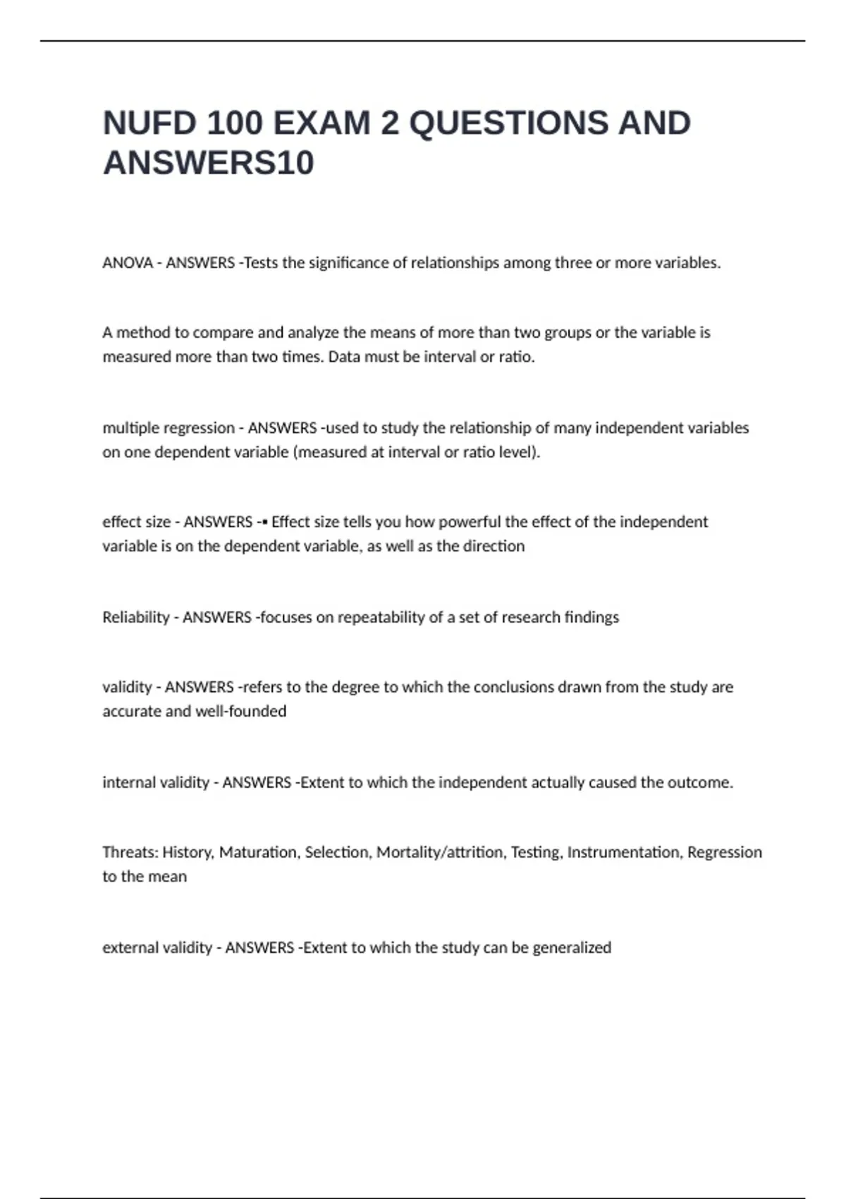 NUFD 100 EXAM 2 QUESTIONS AND ANSWERS ANOVA - ANSWERS -Tests the significance of relationships among three or more variables. A method to compare and analyze the means of more than two groups or the variable is measured more than two times. Data must be interval or ratio. multiple regression - ANSWERS -used to study the relationship of many independent variables on one dependent variable (measured at interval or ratio level). effect size - ANSWERS -▪ Effect size tells you how powerful the effect of the independent variable is on the dependent variable, as well as the direction Reliability - ANSWERS -focuses on repeatability of a set of research findings validity - ANSWERS -refers to the degree to which the conclusions drawn from the study are accurate and well-founded internal validity - ANSWERS -Extent to which the independent actually caused the outcome. Threats: History, Maturation, Selection, Mortality/attrition, Testing, Instrumentation, Regression to the mean external validity - ANSWERS -Extent to which the study can be generalized