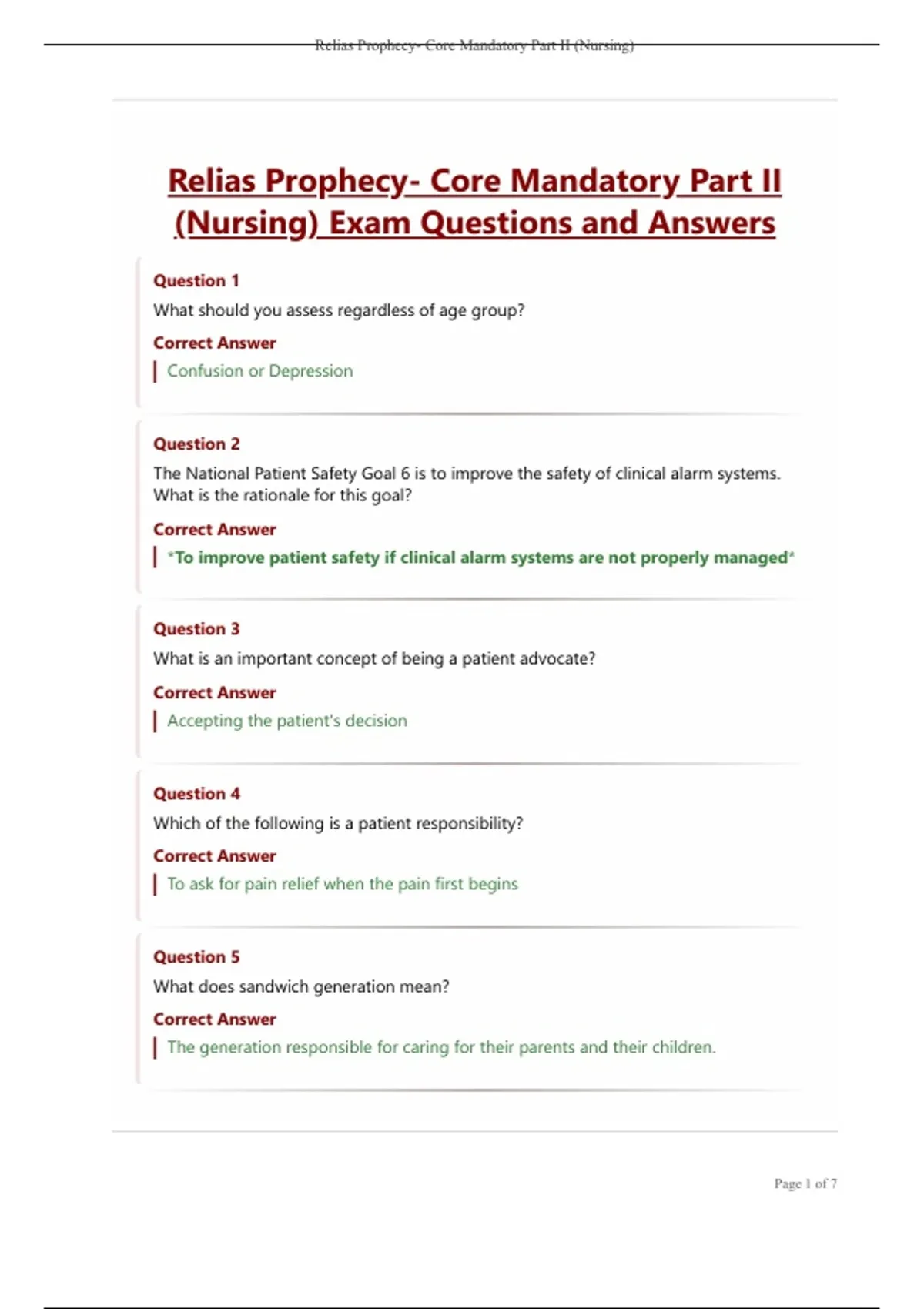 Relias Prophecy- Core Mandatory Part II (Nursing) Exam Questions and Answers