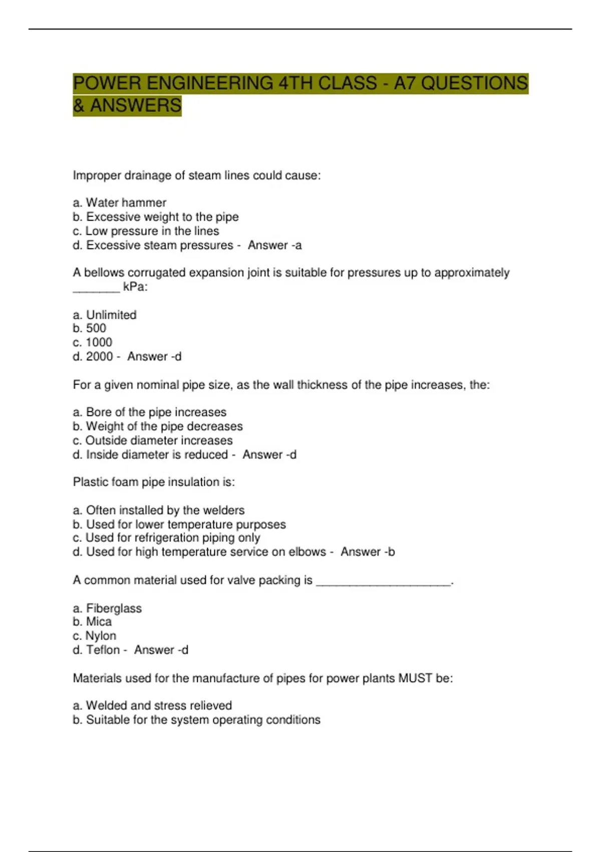 POWER ENGINEERING 4TH CLASS - A7 QUESTIONS & ANSWERS