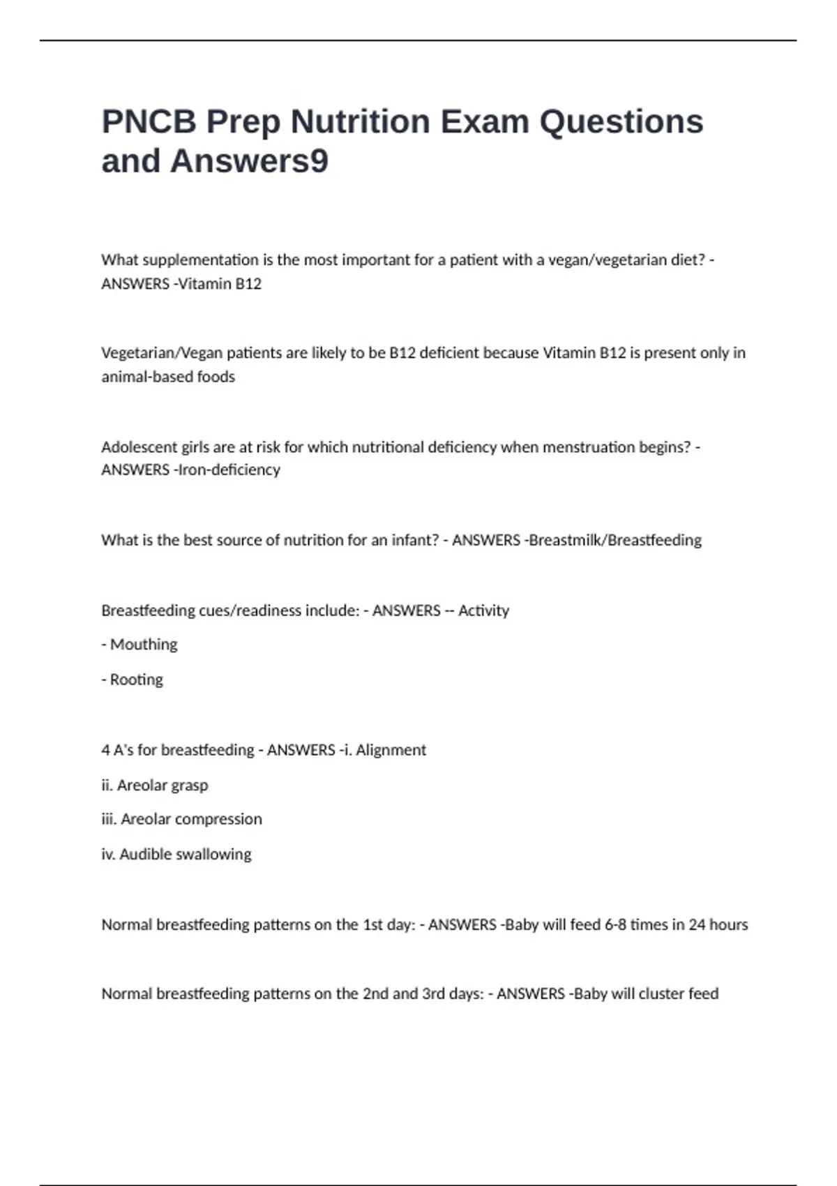PNCB Prep Nutrition Exam Questions and Answers What supplementation is the most important for a patient with a vegan/vegetarian diet? - ANSWERS -Vitamin B12 Vegetarian/Vegan patients are likely to be B12 deficient because Vitamin B12 is present only in animal-based foods Adolescent girls are at risk for which nutritional deficiency when menstruation begins? - ANSWERS -Iron-deficiency What is the best source of nutrition for an infant? - ANSWERS -Breastmilk/Breastfeeding Breastfeeding cues/readiness include: - ANSWERS -- Activity - Mouthing - Rooting 4 A's for breastfeeding - ANSWERS -i. Alignment ii. Areolar grasp iii. Areolar compression iv. Audible swallowing Normal breastfeeding patterns on the 1st day: - ANSWERS -Baby will feed 6-8 times in 24 hours Normal breastfeeding patterns on the 2nd and 3rd days: - ANSWERS -Baby will cluster feed