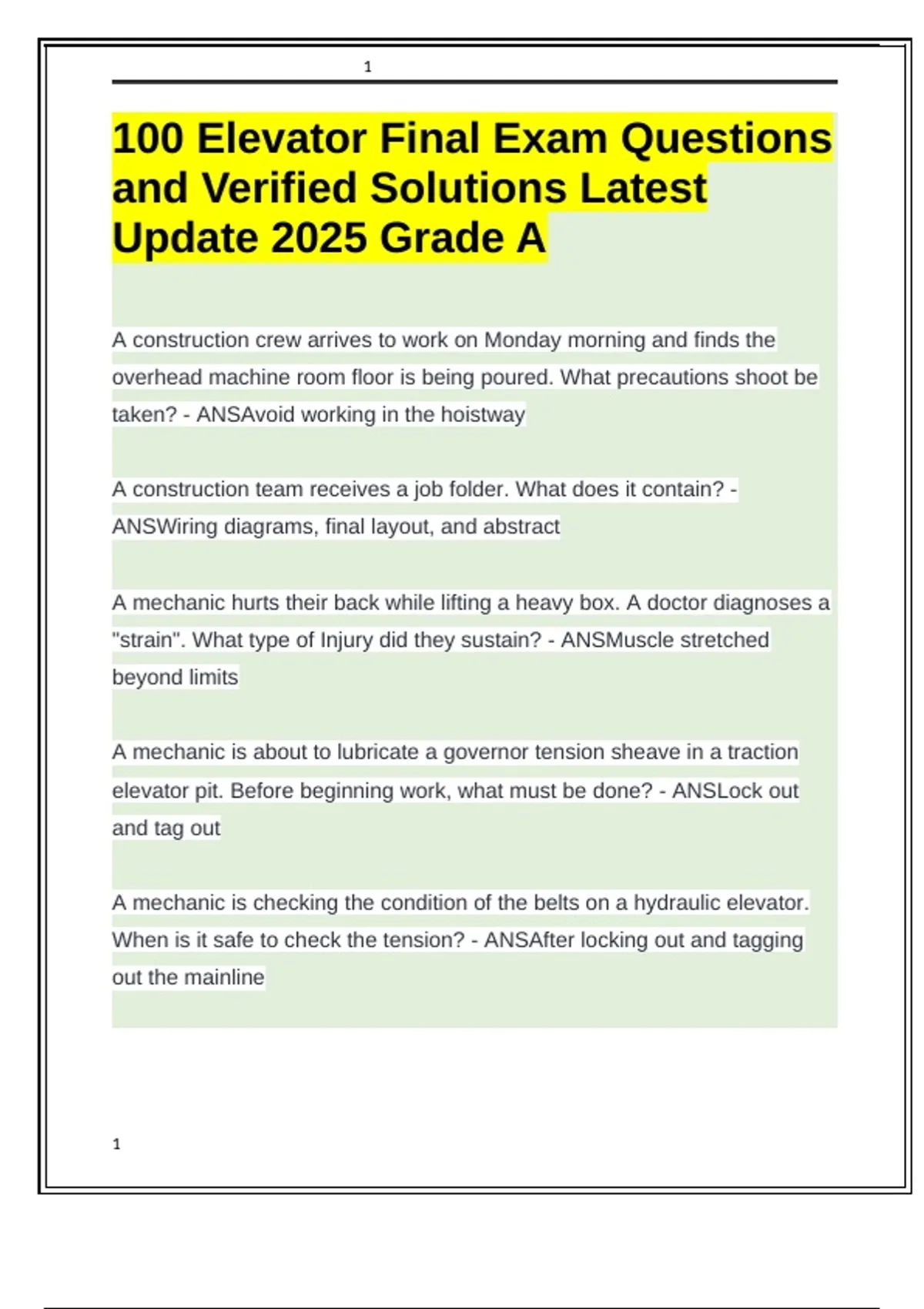 100 Elevator Final Exam Questions and Verified Solutions Latest Update 2025 Grade A.docx