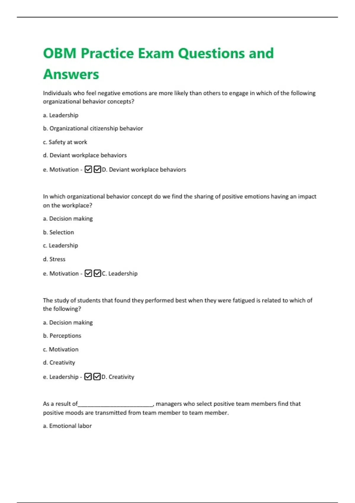 OBM Practice Exam Questions and Answers Individuals who feel negative emotions are more likely than others to engage in which of the following organizational behavior concepts? a. Leadership b. Organizational citizenship behavior c. Safety at work d. Deviant workplace behaviors e. Motivation - D. Deviant workplace behaviors In which organizational behavior concept do we find the sharing of positive emotions having an impact on the workplace? a. Decision making