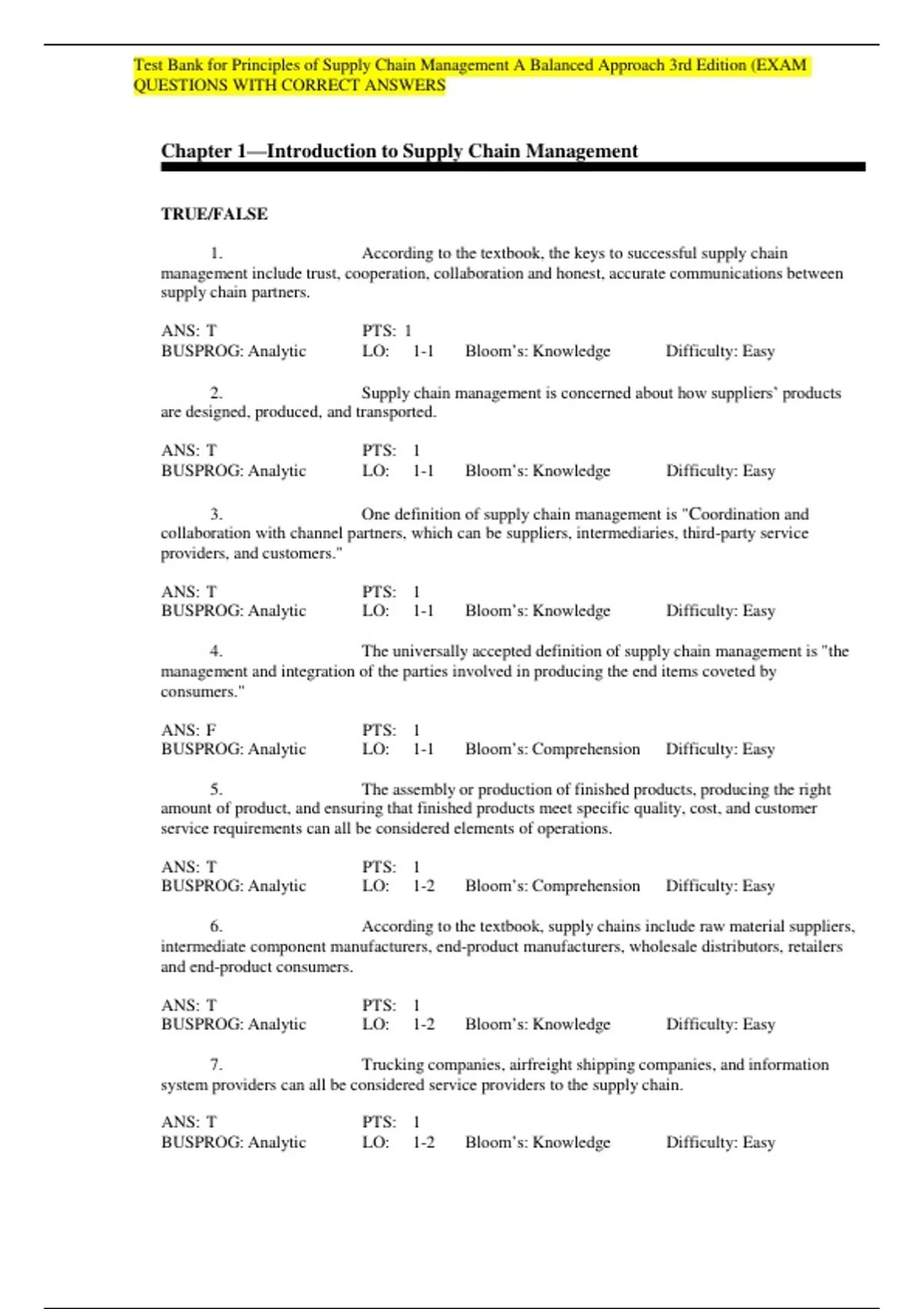 ,Test Bank for Principles of Supply Chain Management A Balanced Approach 3rd Edition (EXAM